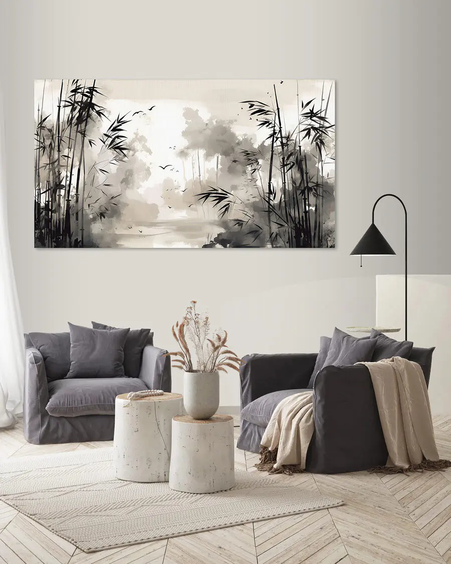 Telkens als je een blik op je muur werpt, waan je je in een rustig bamboebos. Deze zwart-wit canvasprint is misschien wel de zen touch die je ruimte nodig heeft. Perfect voor liefhebbers van de natuur en alles wat sereen is, voegt het eenvoudige maar verbluffende ontwerp een vleugje rust en elegantie toe. Stel je voor dat je gaat zitten met een kopje thee, starend naar je eigen stukje natuur, met het gevoel alsof je het zachte geritsel van bamboebladeren kunt horen. Het is niet alleen decor, het is een kleine ontsnapping naar een vredig moment op elk moment dat je het nodig hebt. Perfect voor woonkamers, slaapkamers of elke andere ruimte die wel wat frisse lucht kan gebruiken (minus de pollen natuurlijk). Of je nu een natuurliefhebber bent of gewoon iemand die houdt van een goede artsy vibe, deze print past precies in het plaatje, waardoor je huis aanvoelt als een rustig toevluchtsoord te midden van de drukte.