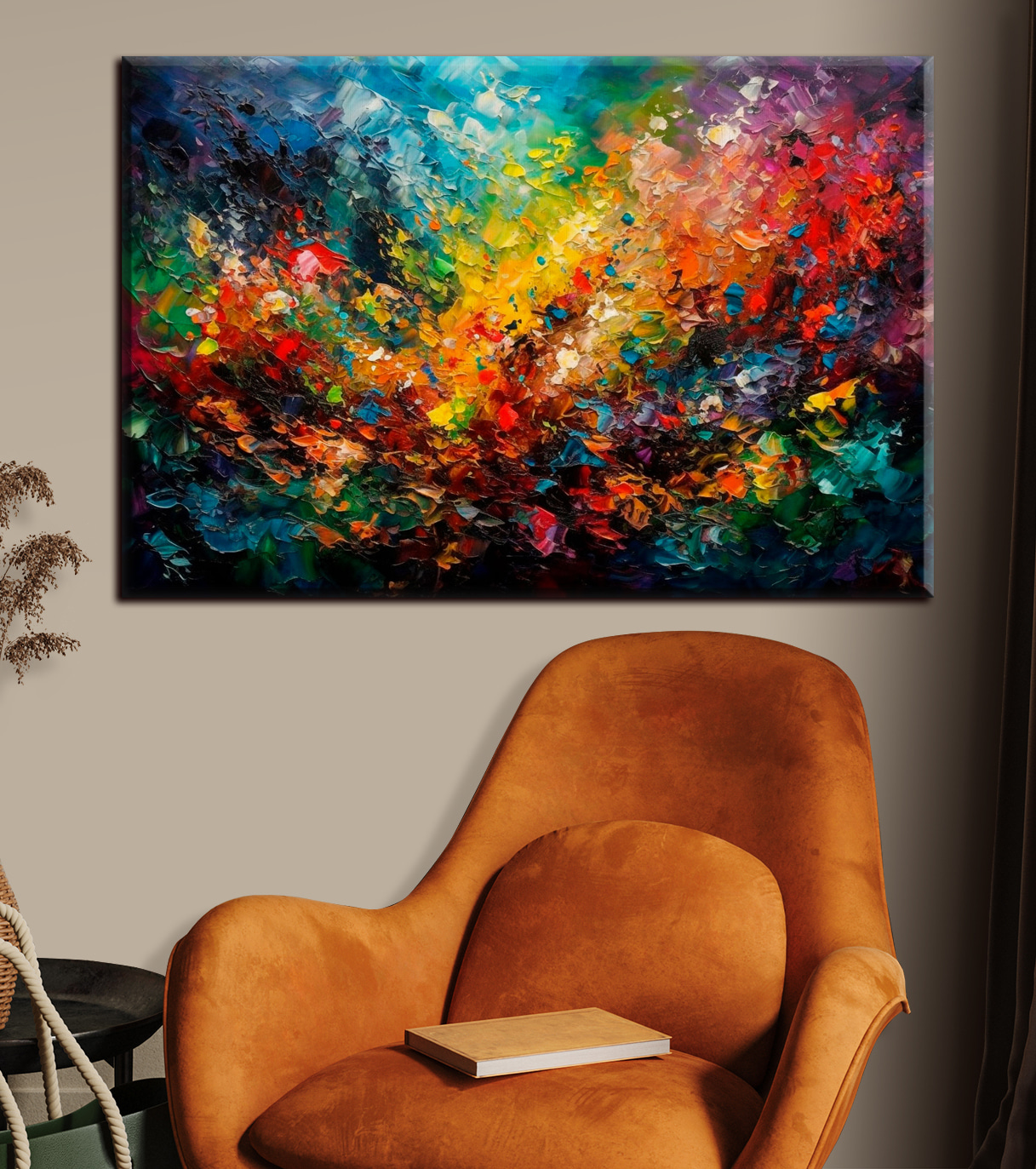 Hoewel dit stuk abstract is, voelt het als een verhaal dat zich op je muur ontvouwt. Misschien is het een levendige herinnering aan een wilde bloemenweide of het pure wonder van een vuurwerkshow – het soort dat je versteld doet staan. Het heeft die textuur en diepte waardoor je het wilt aanraken, de verflagen bijna wilt voelen.