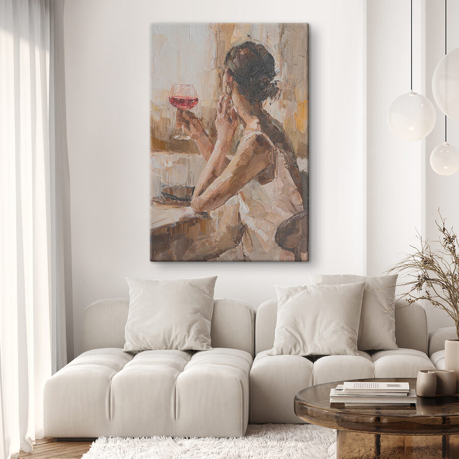 Stap in een moment van rust met dit fascinerende doek waarop een vrouw van haar wijn geniet. Er is iets bijna magisch aan de manier waarop het licht over haar glas danst, wat uitnodigt tot dagdromen en warme gesprekken. Dit werk doet denken aan gezellige avonden, lachen met vrienden en de simpele vreugde van een goede ouderwetse toast. Perfect voor een woonkamer of een rustig hoekje, het voegt een vleugje warmte en elegantie toe aan elke ruimte. Stelt u zich eens voor: een boek in de buurt, een glas in de hand, de serene sfeer opsnuiven – voelt u het al? Dit kunstwerk is een conversatie starter, een zachte herinnering om te genieten van de kleine geneugten van het leven.