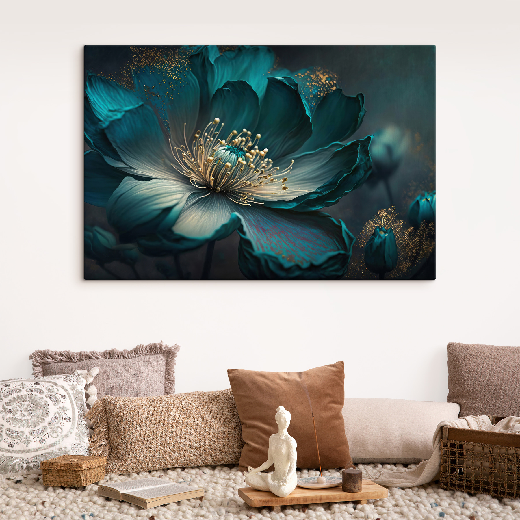 Deze groenblauwe bloemenprint op canvas is echt een topper. Kijk maar naar de manier waarop de bloemblaadjes oplichten met die lichtgevende accenten – het is net alsof de bloem een beetje magie op je muur sprenkelt. Perfect om een vleugje elegantie en een vleugje dromerige kleur toe te voegen aan elke kamer. Stel je voor dat hij boven je bank hangt of het middelpunt vormt van je slaapkamer – wat een uitstraling! Er is iets met die rijke groenblauwe tinten dat je naar binnen trekt en alles een beetje serener laat aanvoelen, nietwaar? Bovendien zit het in de categorie “Bloemen Canvas Kunst”, dus je weet dat het een schot in de roos is.