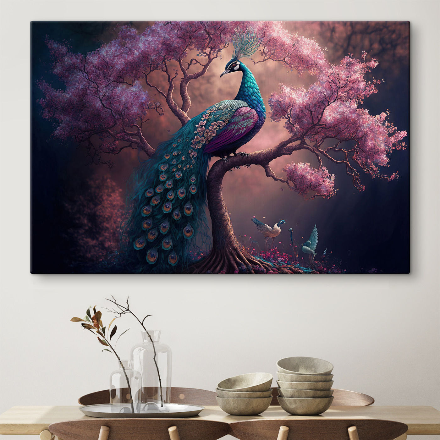 Stel je eens voor dat een plons stralende kleuren je kamer opfleurt, zoals nu. Deze canvasprint van een majestueuze pauw op een boomtak is precies wat je nodig hebt. Al die weelderige veren? Schandalig mooi. En die bloesems? Die fluisteren bijna de lente in je interieur. Je zou bijna een zacht geritsel van bladeren kunnen horen of de schaduw van een briesje kunnen opvangen. Het is niet alleen kunst, het is een oppepper. Een dagelijkse herinnering om schoonheid te omarmen, zelfs in de eenvoudigste dingen. Echt, elke keer als je er langs loopt, zul je waarschijnlijk glimlachen. Perfect voor een onmiddellijke vreugde in elke kamer!