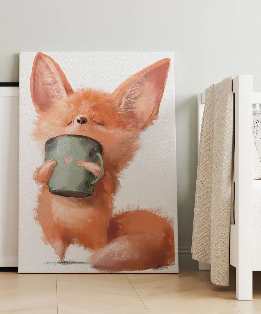 Stap in een wereld van charme met deze prachtige canvasprint met een schattige fennec vos die van een warm drankje geniet. Stel je deze kleine man voor, met zijn ogen dicht, zo tevreden als maar kan – perfect om een knusse noot toe te voegen aan elke kamer. Het is het soort kunstwerk dat een glimlach op je gezicht tovert, of het nu in de speelkamer van een kind staat of in een gezellig hoekje van je woonkamer. Stel je een luie middag voor met een kopje thee, je favoriete boek en deze kleine vos die over je waakt. Het is alsof je een vrolijke metgezel hebt die je hart verwarmt en je muren opfleurt met eigenzinnigheid. Fleur je kamer op met deze charmante kunst die zeker voor een gesprek of twee zal zorgen!