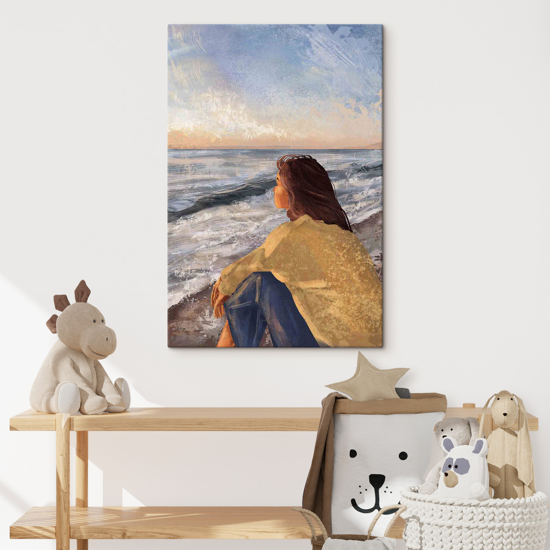Stel je dit eens voor: een vredige avond aan de kust, waar je het zachte zand onder je voeten voelt en de zon langzaam ziet ondergaan boven de eindeloze oceaan. Dat is wat deze canvasprint vastlegt – een bijna magisch moment waarop de tijd lijkt stil te staan. Een vrouw, in gedachten verzonken, kijkt uit over de zachte golven. Je kunt de stilte van de zee bijna horen en een licht briesje op je gezicht voelen. Perfect voor iedereen die een beetje rust in huis nodig heeft. Of het nu een middelpunt in de woonkamer is of een serene toevoeging aan een slaapkamer, dit stuk nodigt je uit om even stil te staan en te dromen. Wie zou dat niet willen?