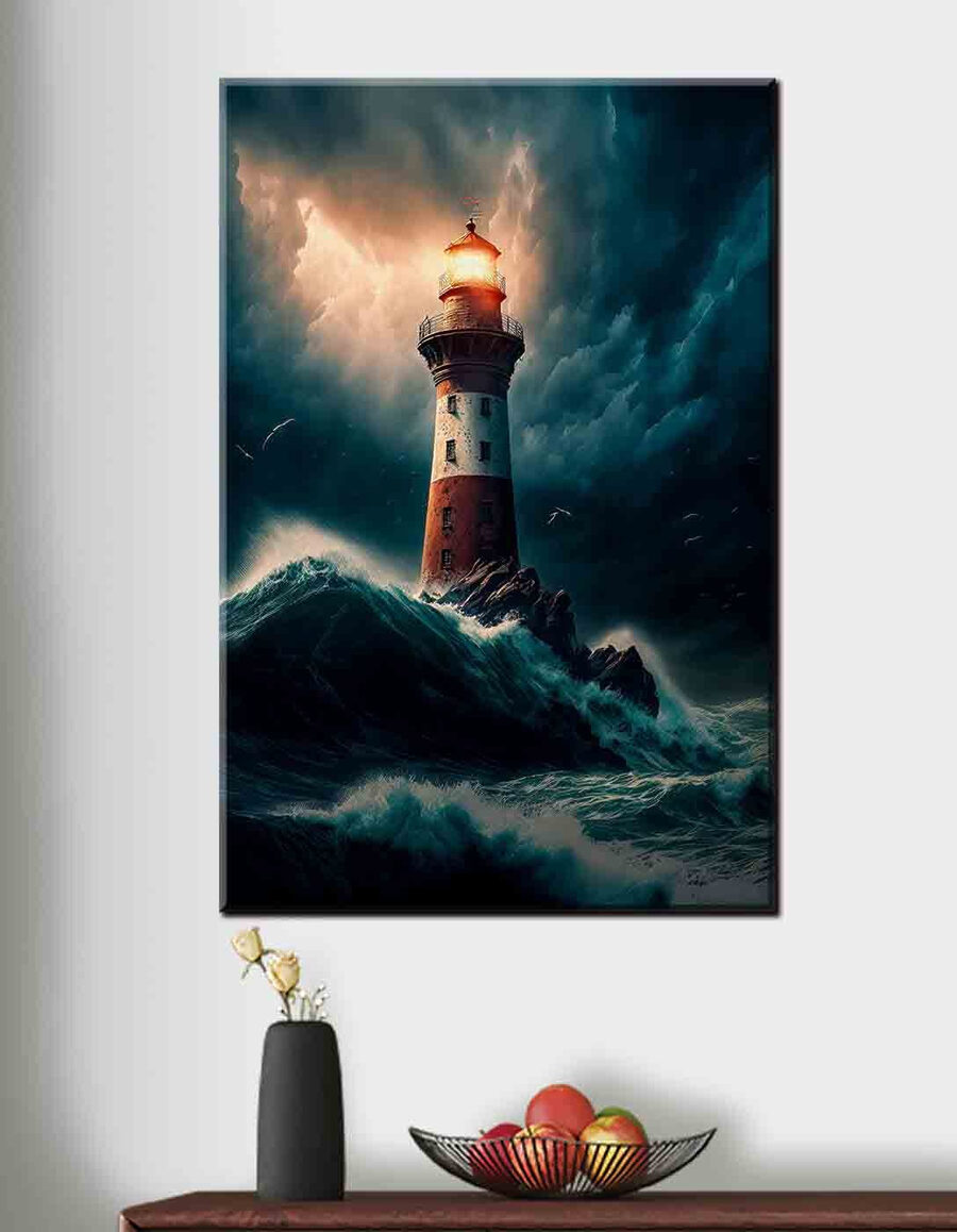 Stel je voor dat dit doek boven je bank hangt – het is niet alleen een kunstwerk, maar ook een conversatiestarter. Vrienden komen langs en plotseling dromen jullie allemaal over avonturen aan zee, onstuimig weer en die ene film met die vuurtoren (je weet wel). De mix van sereen en stormachtig brengt je tot rust maar herinnert je ook aan de rauwe schoonheid van de natuur. Plus, die kleuren! Zo levendig dat het bijna lijkt alsof de golven uit elkaar spatten.