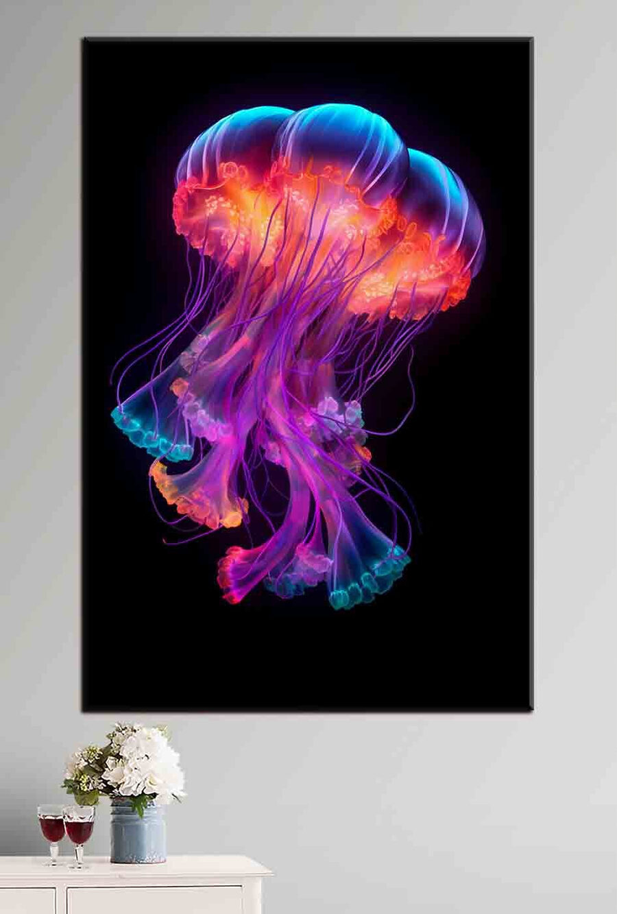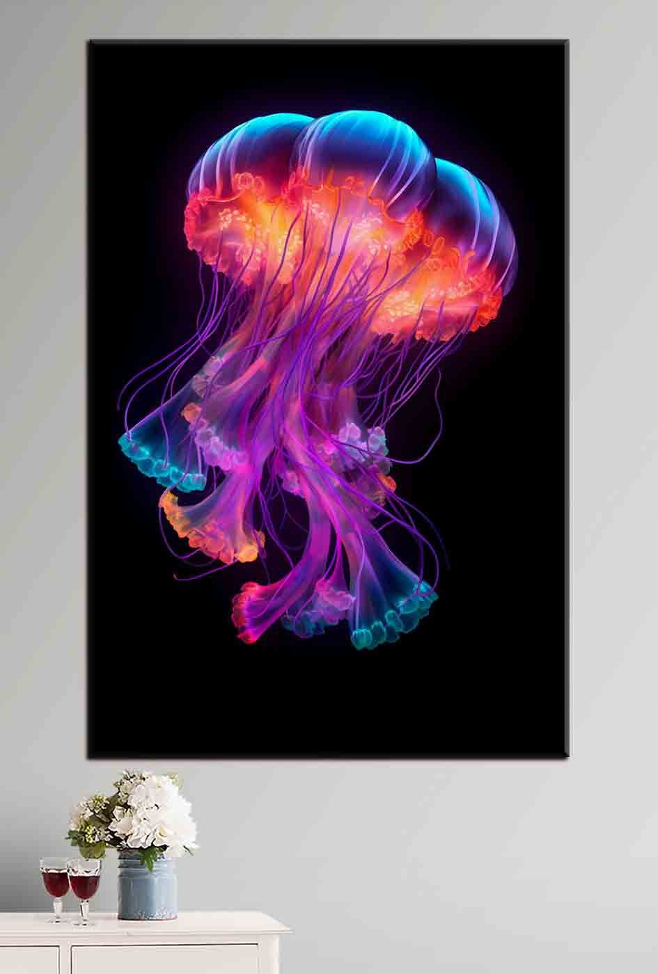Bekijk deze prachtige canvasprint “Neon kwal glijdt door duisternis”. Kun je je de gloed ervan niet voorstellen in een anders zo schemerige kamer? Dit werk voelt een beetje alsof je diep in de oceaan duikt zonder je bank te verlaten. De levendige, neonkleuren tegen een pikzwarte achtergrond zijn iets anders – het is net alsof deze kwallen van het doek af zweven. Perfect voor plekken die een vleugje intrige nodig hebben, of het nu je woonkamer, thuiskantoor of zelfs een trendy café is. Heb je een ruimte die een knaller kan gebruiken? Dit is het.