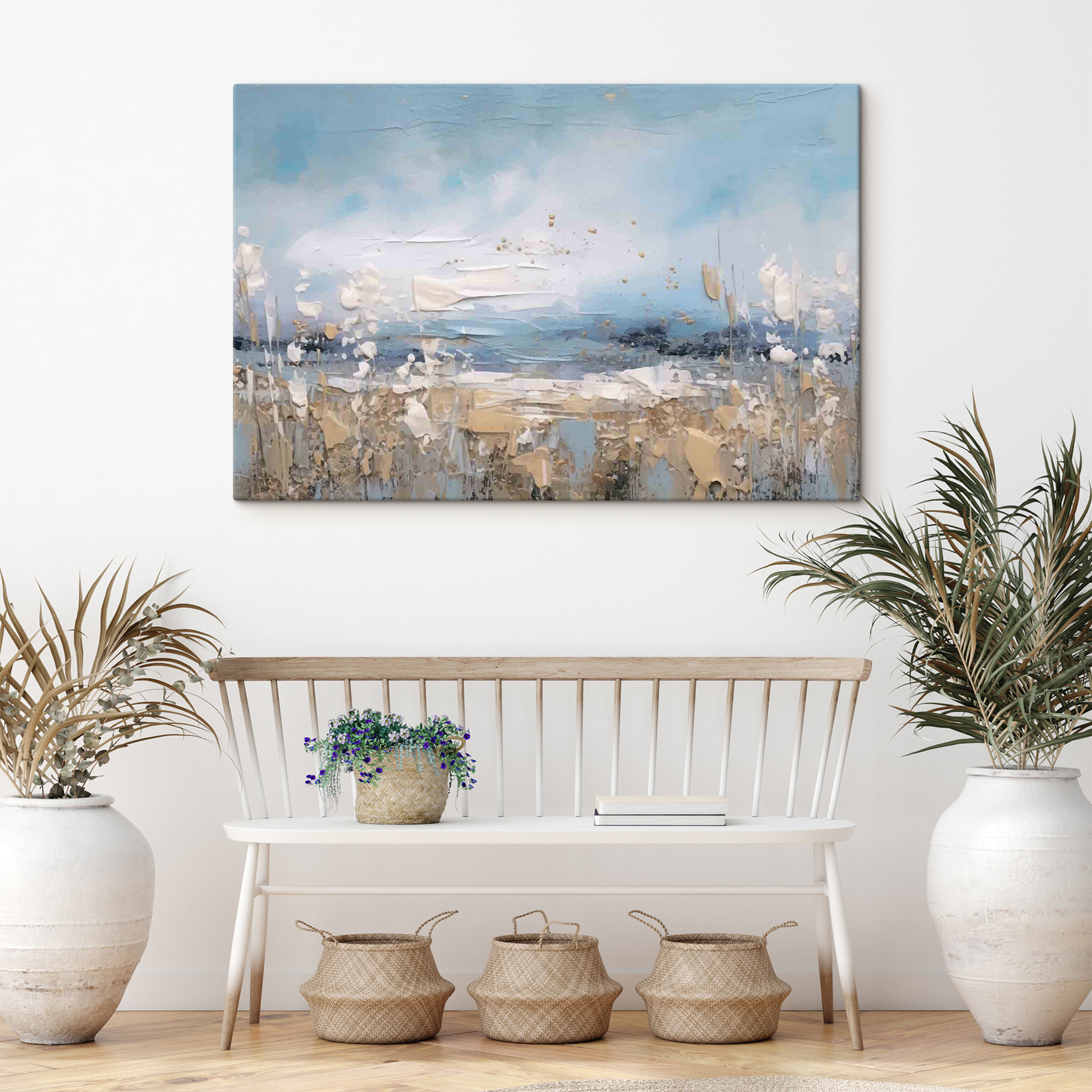 Stel je voor: je luiert in je favoriete stoel, een kopje thee in de hand, starend naar de subtiele vormen en kleuren. Het is net je eigen kleine ontsnapping, aan je muur. Vrienden zullen ernaar kijken, even pauzeren, misschien hun hoofd een beetje schuin houden en glimlachen. Het is kunst die je aan het denken zet of gewoon geniet van de vredige, bijna grillige toets die het aan je ruimte toevoegt.