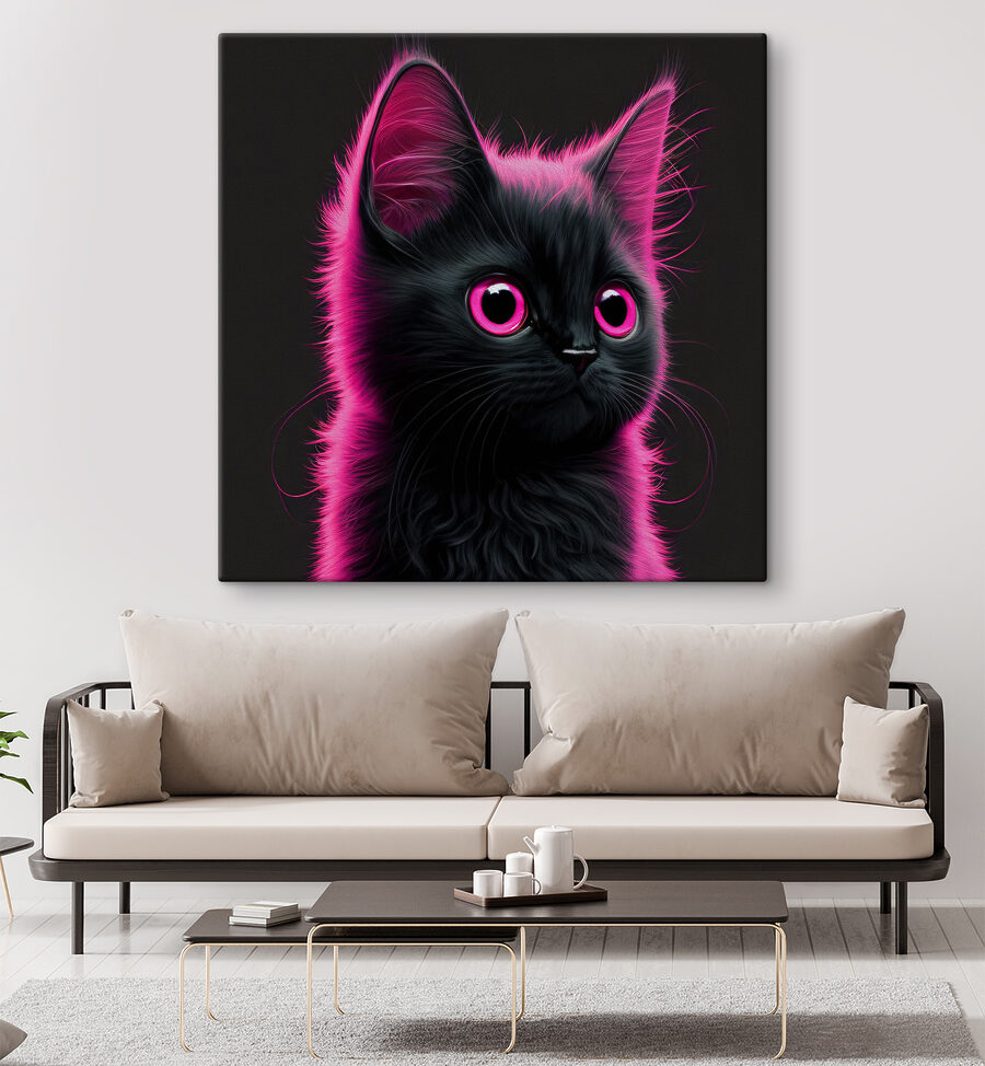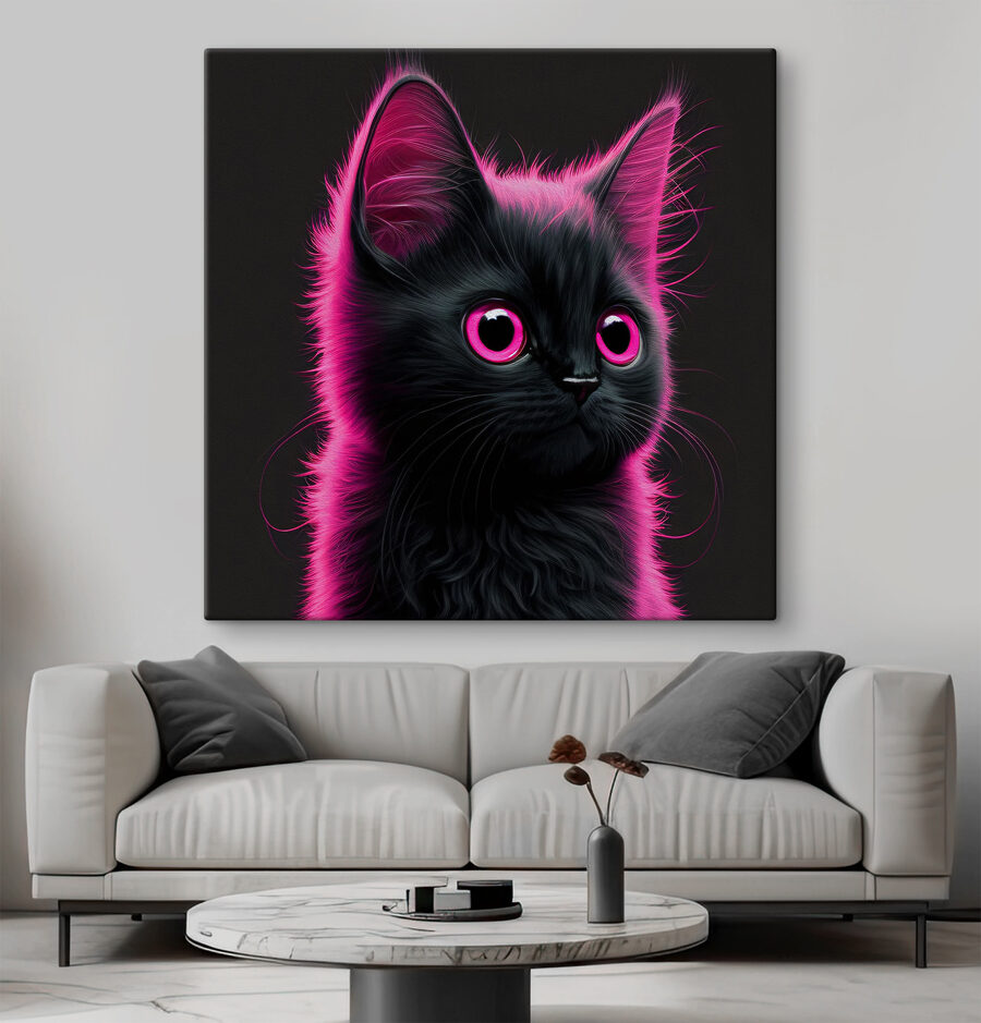 Wil je een vleugje eigenzinnige charme toevoegen aan je interieur? Maak dan kennis met de “Black Cat with Pink Hair” canvasprint! Dit betoverende stuk ziet er niet alleen mooi uit, het is een conversatiestarter. Stel je voor dat deze stoere zwarte kat met een vleugje roze je muur siert en een vleugje eigenzinnigheid en mysterie toevoegt aan elke kamer. Perfect voor zowel kattenliefhebbers als kunstfanaten, het geeft vreugde met zijn levendige kleuren en ondeugende ogen. Plaats het in je woonkamer of hal en kijk hoe het de sfeer verandert. Wie wist dat een kat zo fashion-forward kon zijn?