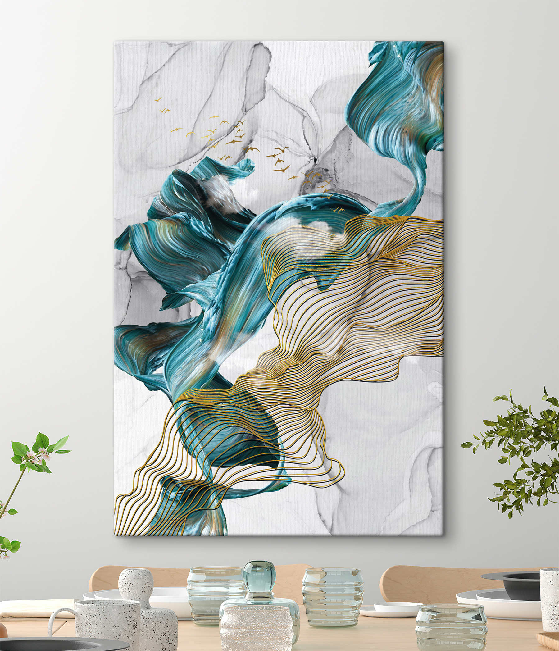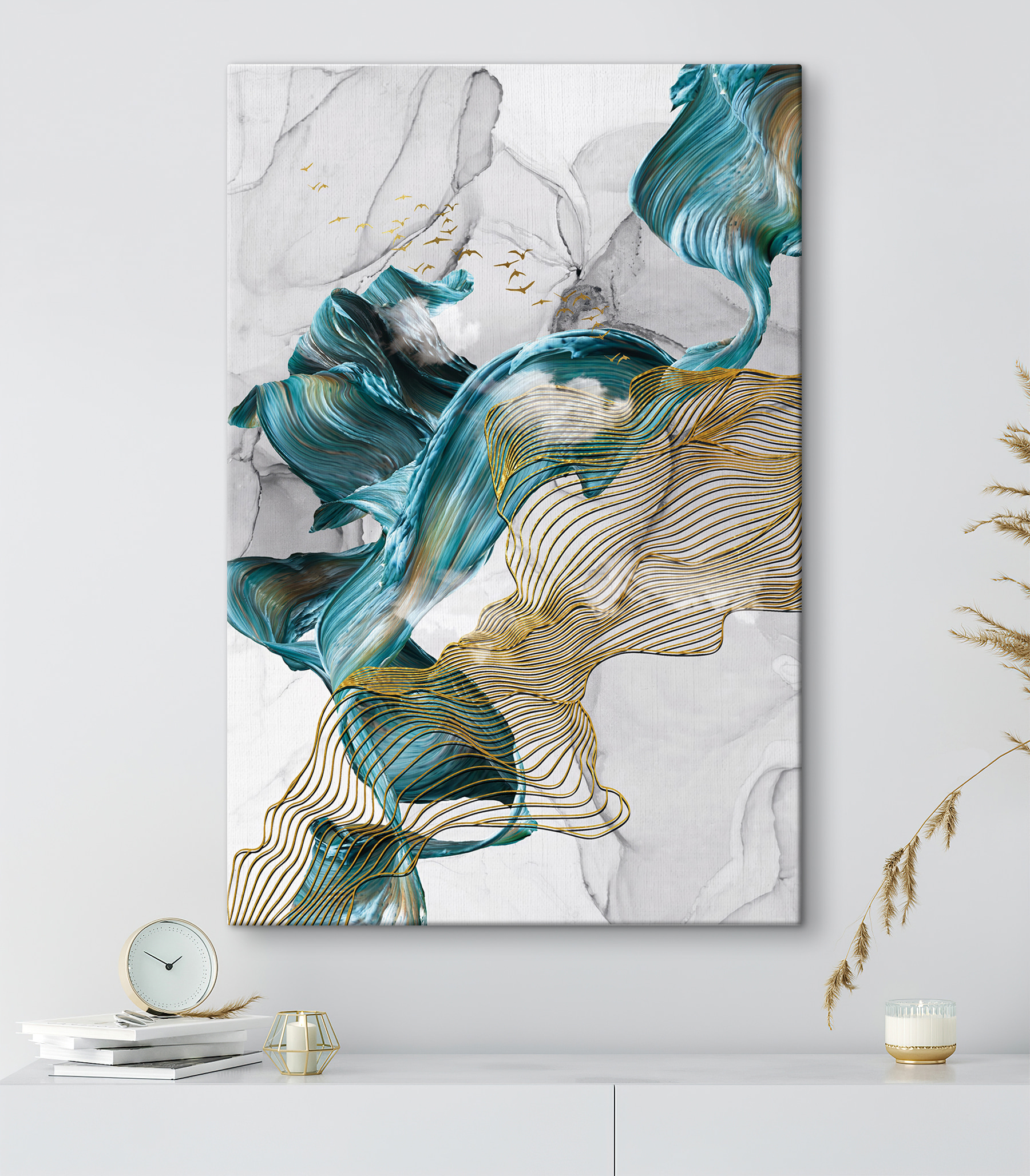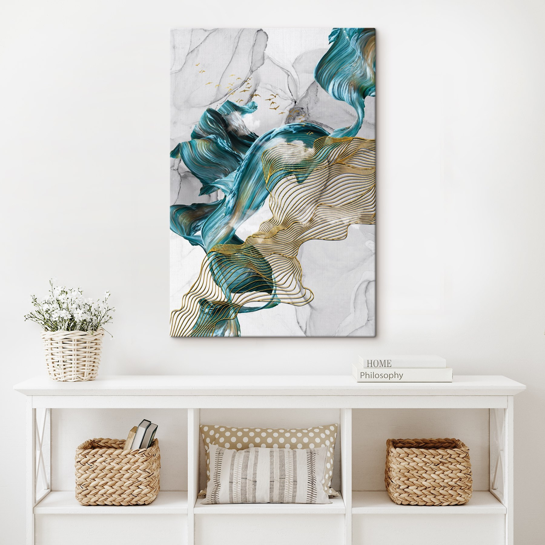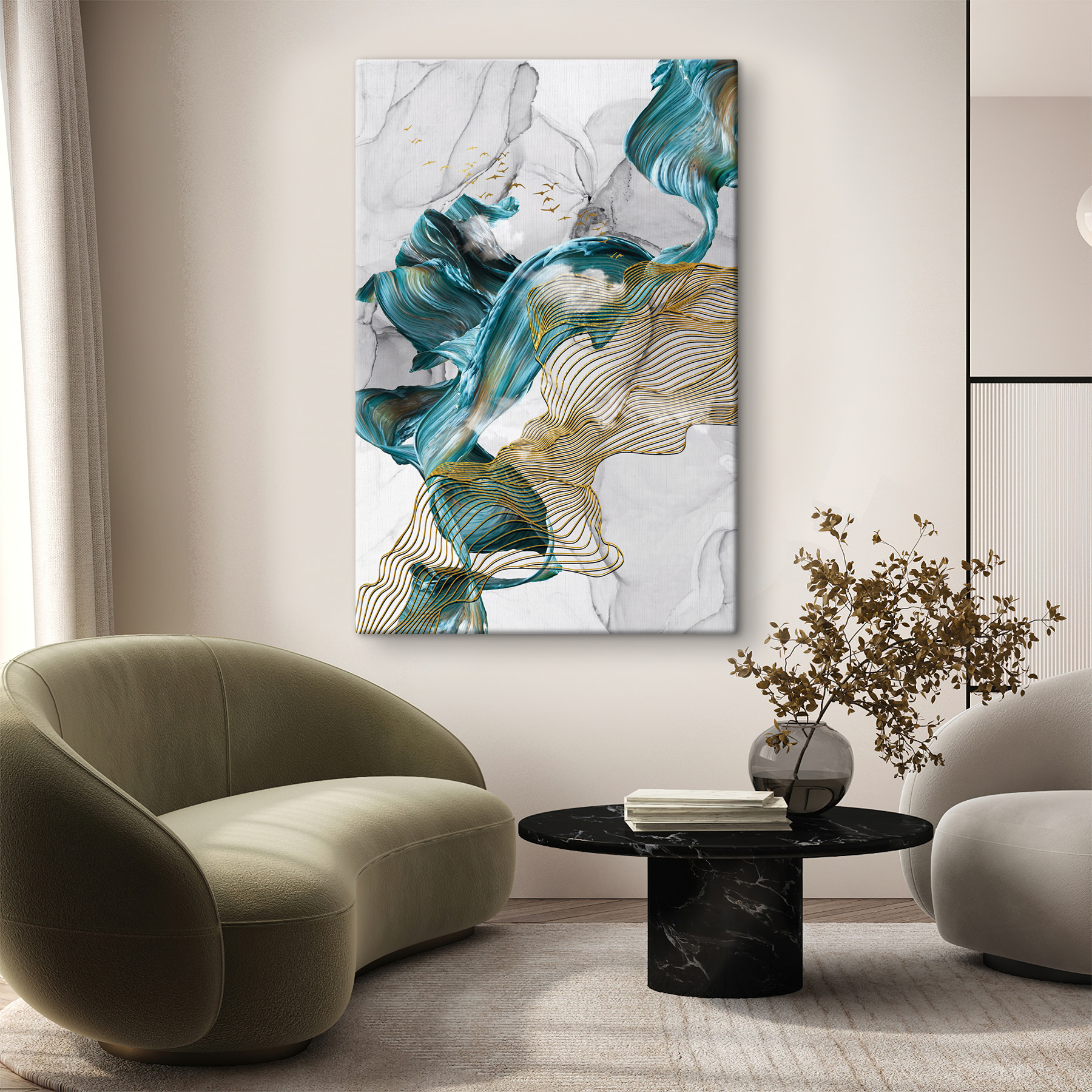 Transformeer je ruimte met deze levendige canvasprint, “Elegante wervelingen en vogels in beweging”. Het legt een speelse dans van kleuren en lijnen vast, alsof de wind geheimen door de bomen fluistert. Stel je voor dat je het in een gezellig hoekje hangt of boven een strakke bank; het zal zeker gesprekken op gang brengen. De zachte beweging in het ontwerp creëert een kalmerende sfeer, perfect om tot rust te komen na een lange dag. Het is alsof je een stukje natuur mee naar binnen neemt, zonder de insecten! Dit kunstwerk nodigt uit tot nadenken en dagdromen en voegt een vleugje creativiteit toe aan elke kamer.