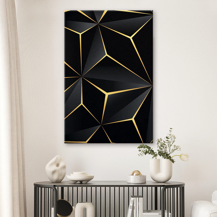 Transformeer elke ruimte met deze levendige canvasprint met een opvallend zwart en metallic geometrisch ontwerp. Het is als een conversatiestarter met hoeken en vormen die over het oppervlak dansen, waardoor het onmogelijk is voor gasten om niet op te vallen. Stel je voor hoe het voelt als het zonlicht het ontwerp vangt – het is bijna alsof de kunst een persoonlijkheid heeft. Perfect voor een chique woonkamer of een gezellig kantoorhoekje, voegt dit stuk karakter toe zonder om aandacht te schreeuwen. Laat het een beetje van je unieke stijl en creativiteit weerspiegelen. Het is kunst die uitnodigt tot nieuwsgierigheid en verwondering.