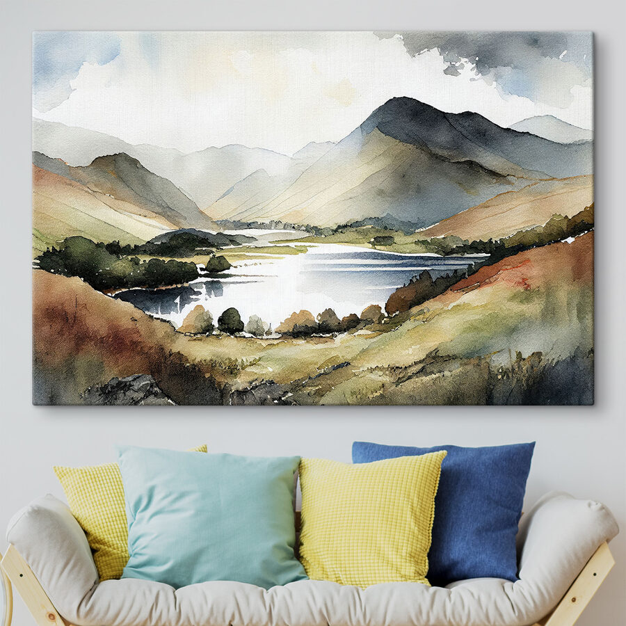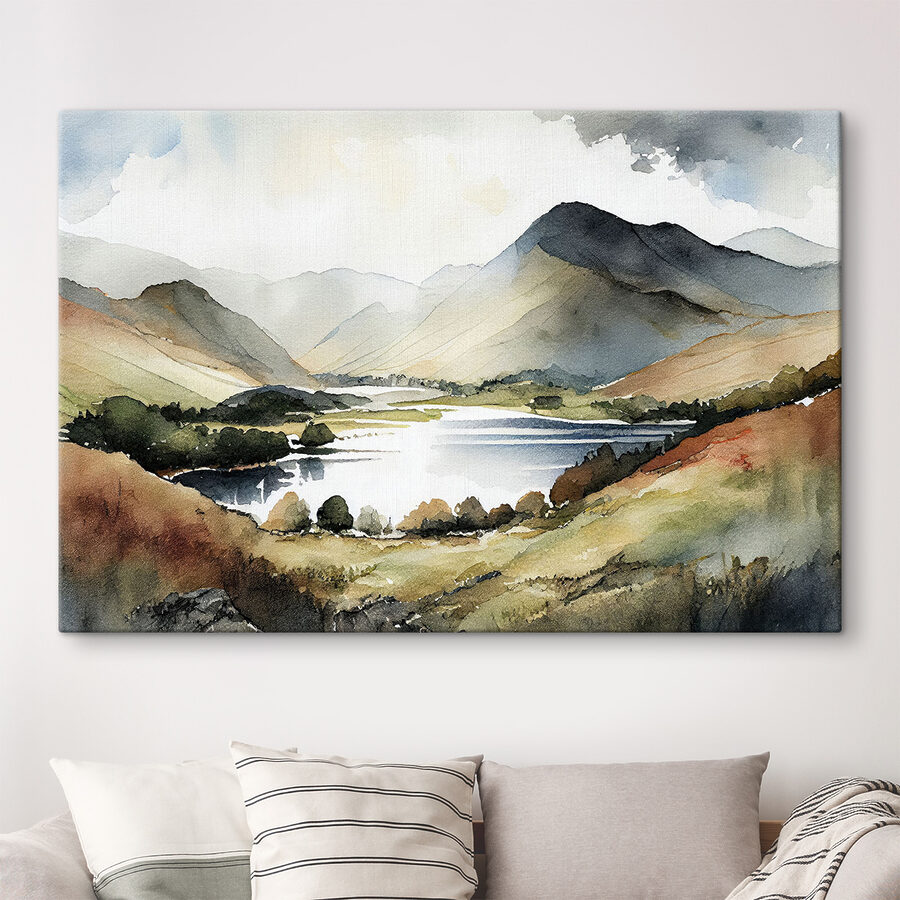 Stel je voor dat je elke ochtend wakker wordt met dit vredige uitzicht! Deze adembenemende canvasprint toont een sereen meer omringd door majestueuze bergen. In een zachte aquarelstijl is het als een zachte knuffel voor je ogen – perfect om een vleugje natuur in huis te halen. Of je nu een kunstliefhebber bent of gewoon van gezelligheid houdt met iets moois, dit stuk zal er zeker bij passen.