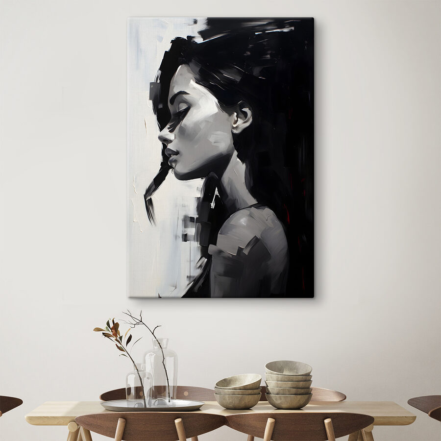 Deze prachtige canvasprint legt de essentie van een vrouw vast op een manier die bijna dromerig aanvoelt. Met gedurfde penseelstreken en een opvallend contrast brengt het een gevoel van mysterie in elke kamer. Stel je voor dat je dit werk in een gezellige leeshoek hangt, waar het aanzet tot dagdromen en gesprekken. Het heeft een moeiteloze uitstraling, waardoor het perfect is voor een relaxte woonruimte. Vrienden kunnen even stilstaan en nadenken over de betekenis of misschien gewoon genieten van de esthetische charme. Het is als een stille metgezel – altijd aanwezig, gevoelens en gedachten oproepend zonder een woord te zeggen. Perfect voor mensen die houden van kunst die een verhaal vertelt.