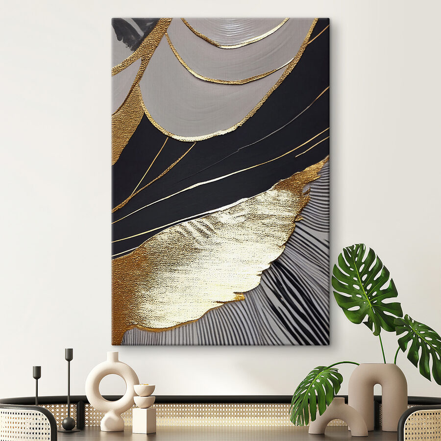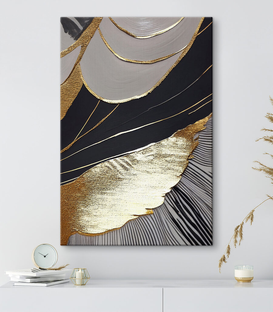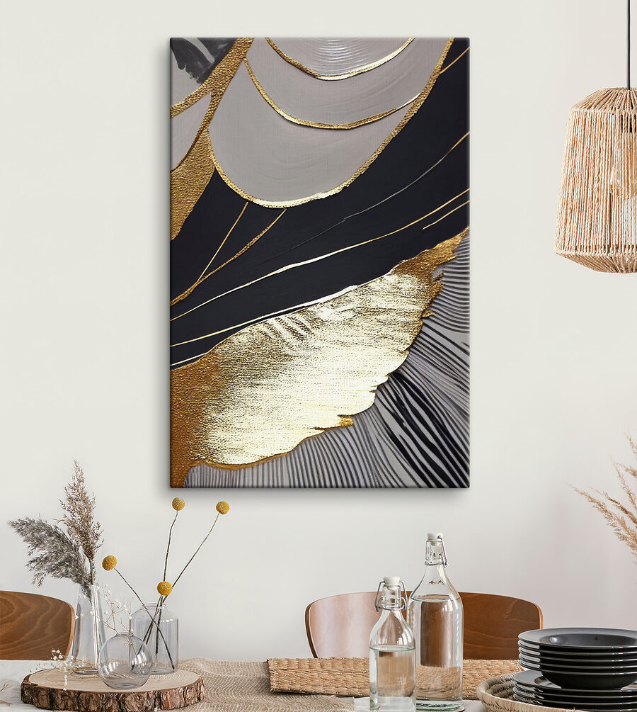 Transformeer je kamer met deze fascinerende canvasprint met abstracte zwarte en metallic patronen. Het is alsof je een stuk moderne kunst in je woonkamer brengt – geen pretentieus galeriebezoek nodig. Stel je voor dat dit opvallende kunstwerk je favoriete kamer verankert en intrigerende gesprekken losmaakt tijdens informele bijeenkomsten. Het gedurfde ontwerp trekt de aandacht en past naadloos in verschillende inrichtingsstijlen, of het nu gezellig of chic is. Stel je een rustige avond voor, alleen jij en de betoverende patronen, in gedachten verzonken. Het is kunst die levendig aanvoelt, waardoor elke blik een klein moment van verrukking wordt.
