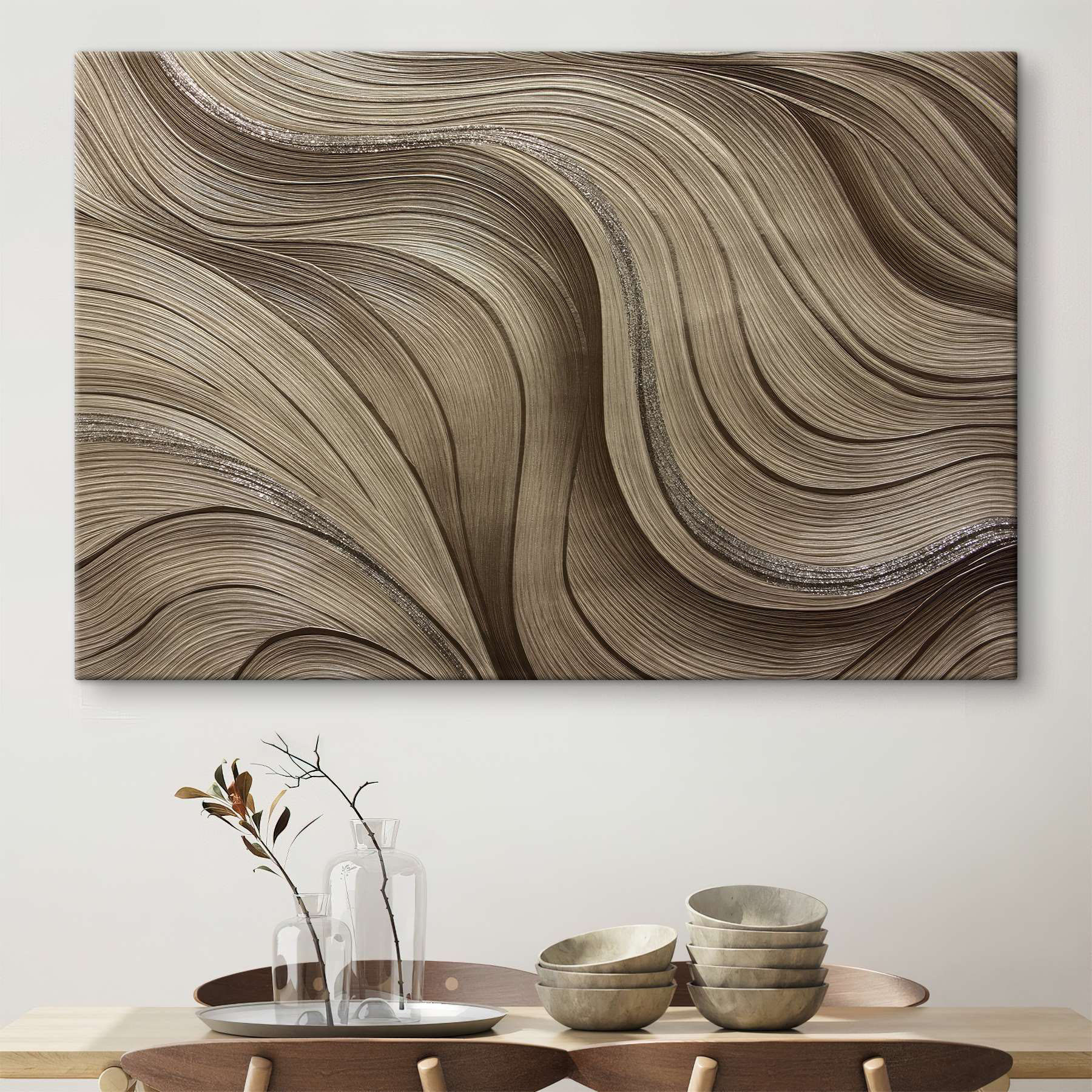 Maak kennis met de “Flowing Lines in Earthy Tones” canvas print-een heerlijke ontsnapping voor je muren! Stel je voor dat deze schoonheid je woonkamer verlicht, waar wervelingen van warm bruin en zacht neutraal een gezellige sfeer creëren. Het is alsof je je kamer in een warme deken hult, maar dan zonder het risico dat je er thee op morst. Dit meubel staat daar niet zomaar, het nodigt uit tot een gesprek. Vrienden zullen het opmerken en wie weet ontketent het een debat over abstracte kunst of laat het hen op zijn minst vragen: “Wat betekenen die lijnen?”.