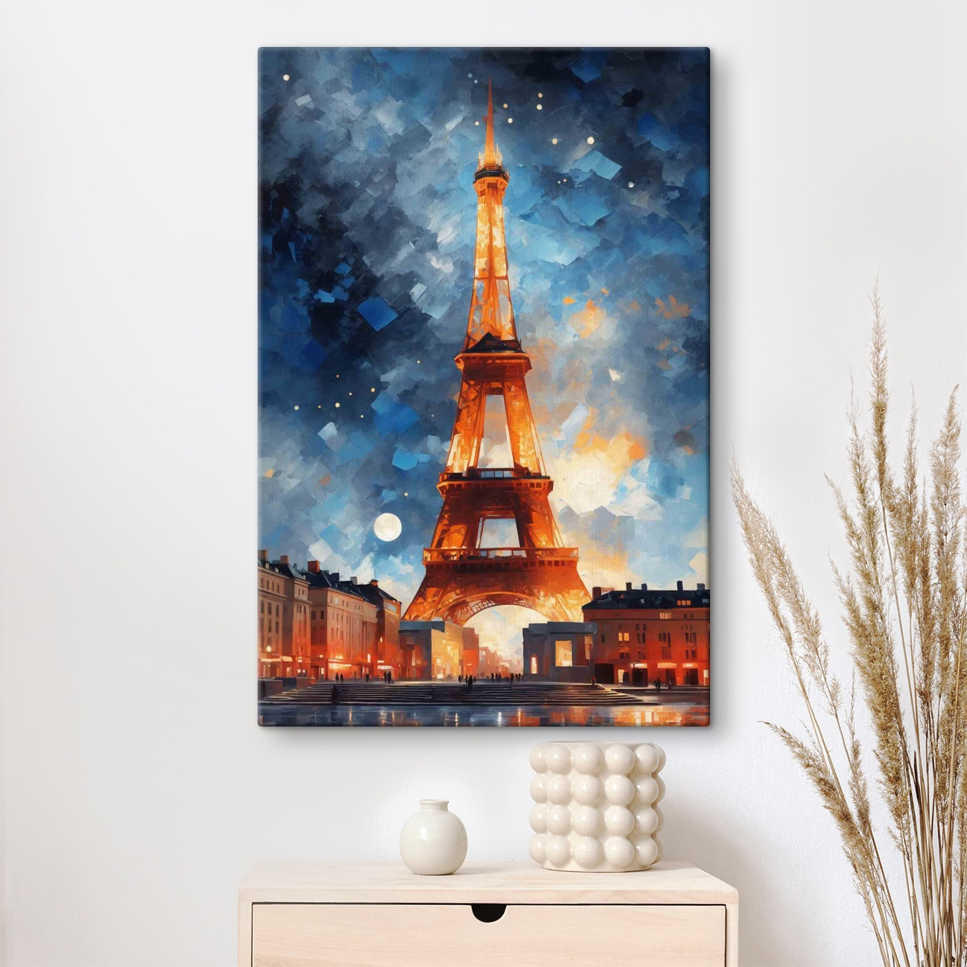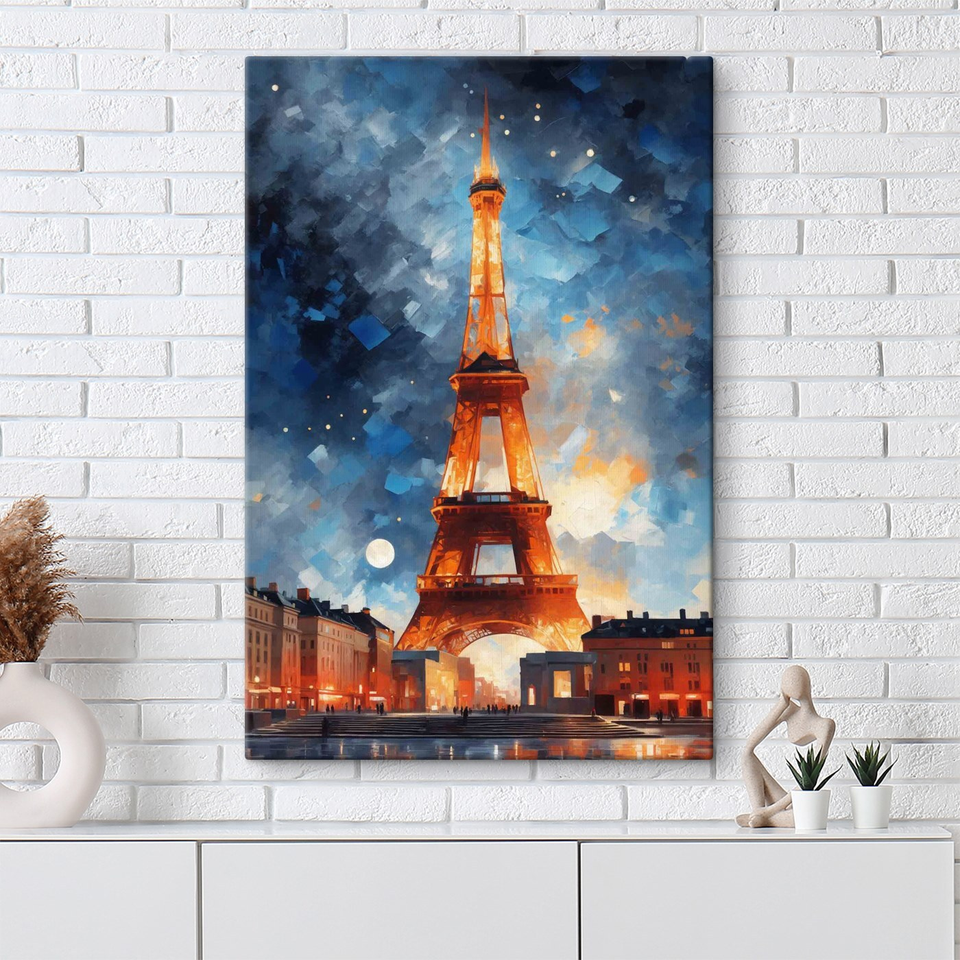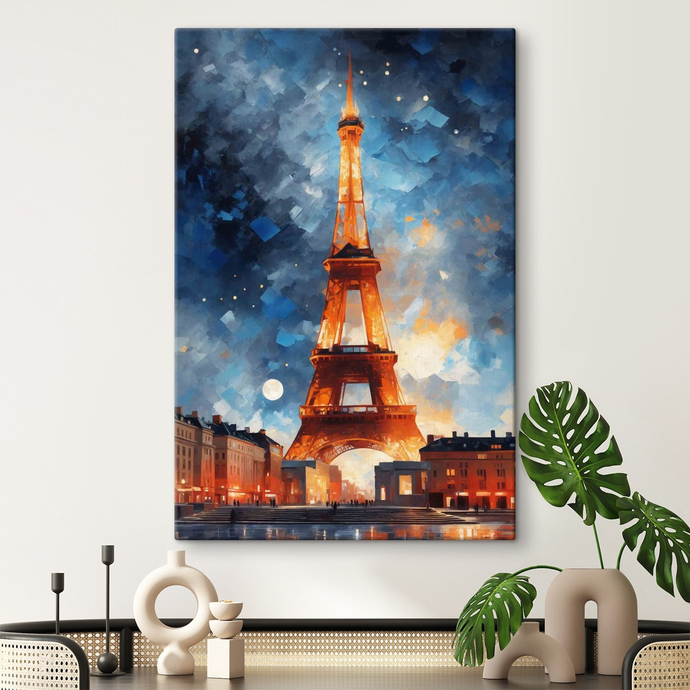 Stel je voor: je zit thuis van je avondthee te nippen en voor je neus zie je een prachtige canvasprint van een toren tegen de nachtelijke hemel. Het is alsof iemand een moment heeft vastgelegd waarop de toren besloot zijn mooie, fonkelende avondoutfit aan te trekken. De diepe blauwtinten en warme lichten brengen een vleugje magie in elke ruimte. Zie het als een venster naar een andere wereld waar de lucht fris en vol mogelijkheden is. Perfect voor die plek in je woonkamer die gewoon smeekt om een beetje “wow”-factor. Telkens wanneer je een blik in de richting van de lamp werpt, zul je merken dat je verdwaalt in zijn charme en misschien droomt van verre landen.