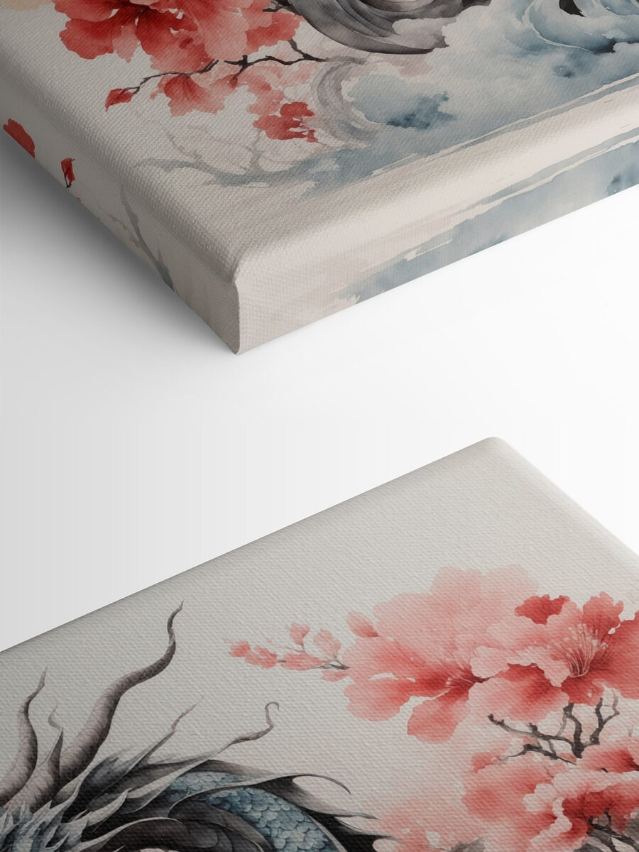 Stel je het meest mythische wezen voor dat je ooit hebt gezien, en stel je nu voor dat het omringd is door delicate kersenbloesems – dat is wat je krijgt met deze “Schilderij van een draak” canvasprint! Het is alsof je een stukje van een sprookje in je woonkamer hebt. Ik bedoel, die draak lijkt bijna klaar om tevoorschijn te springen en magische vlammen te spuwen. Het contrast van zijn woeste, geschubde lichaam met de zachtheid van de bloemen zorgt voor een verbluffend visueel evenwicht.