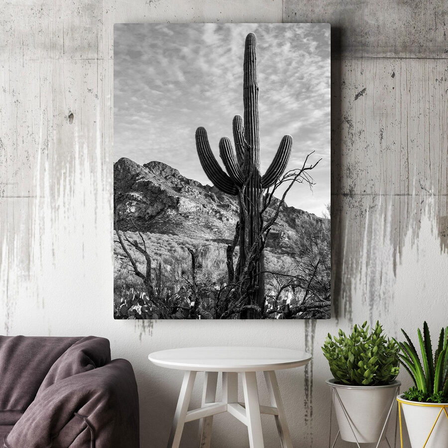 Stel je voor dat je een stukje woestijn naar je woonkamer brengt met deze prachtige canvasprint “Cactus in the Desert”. Hij is zwart-wit, dus hij past overal bij. Maar dit is niet zomaar een cactus – hij heeft karakter. Bijna alsof hij zijn armen opheft en zegt: “Kijk naar mij!”. Perfect voor die luie zondagochtenden waarop je gewoon koffie wilt drinken en wilt dagdromen. Dit werk inspireert misschien tot gesprekken over avontuur, of misschien gewoon meer koffie. Hoe dan ook, het zal zeker een gespreksonderwerp worden!