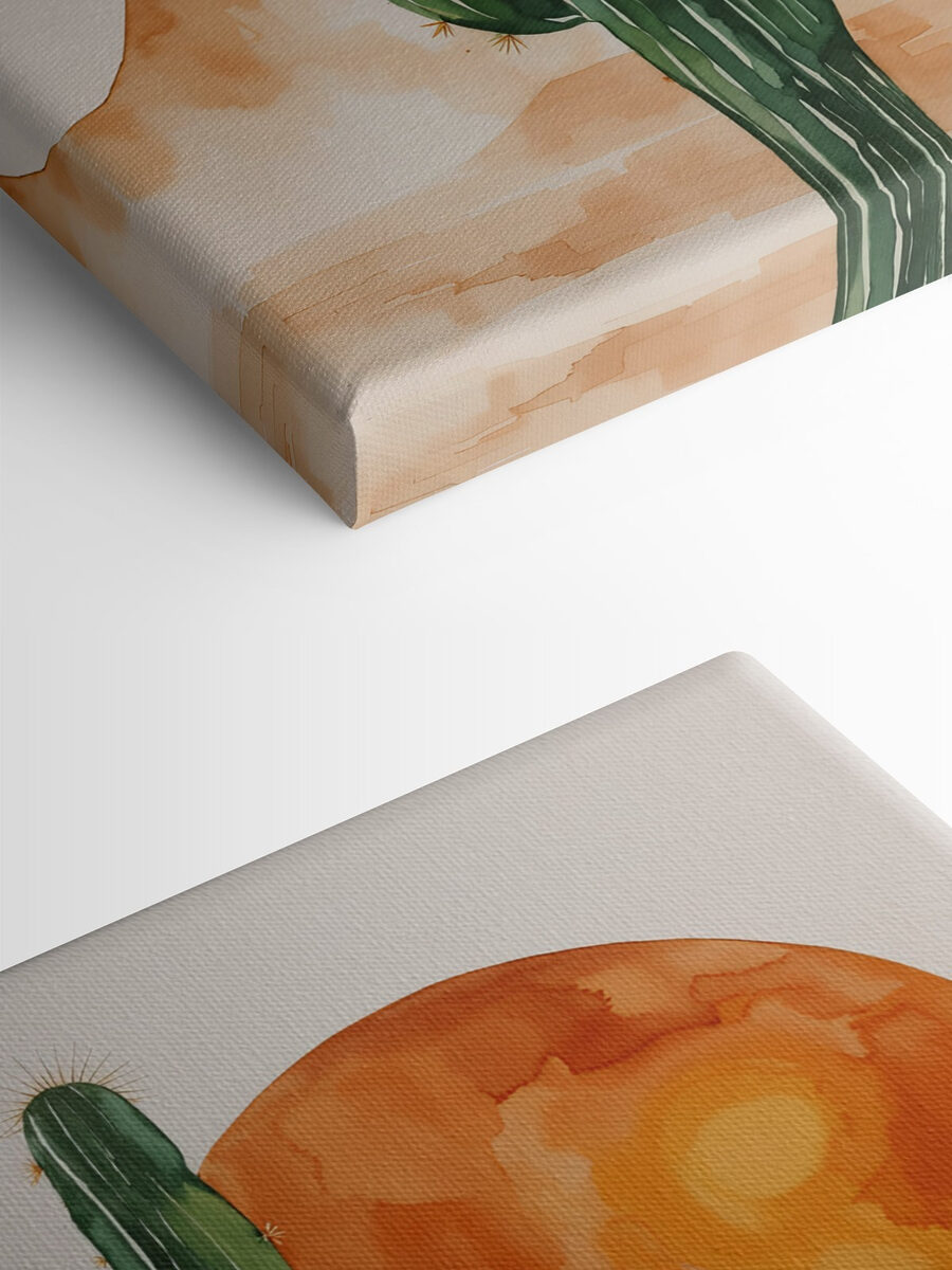 Stel je voor dat je de warmte van de woestijn in huis haalt met deze levendige canvasprint! Met een speelse cactus die naar de hemel reikt onder een felle zon, is het een vrolijke herinnering dat zelfs stekelige dingen kunnen gedijen. Zie het voor je in een zonnig hoekje, misschien in de buurt van een comfortabele stoel, uitnodigend om koffie te drinken en te dagdromen. Elke blik wekt een beetje reislust op, waardoor je het gevoel krijgt dat je in een zonovergoten avontuur verwikkeld bent. Perfect om elke ruimte op te fleuren, dit stuk serveert een stukje schoonheid van de natuur en voegt een unieke draai toe aan je inrichting. Dus waarom zou je deze cactus niet een beetje vreugde en kleur aan je muren laten brengen?