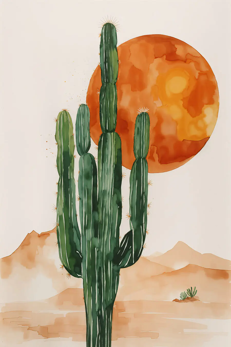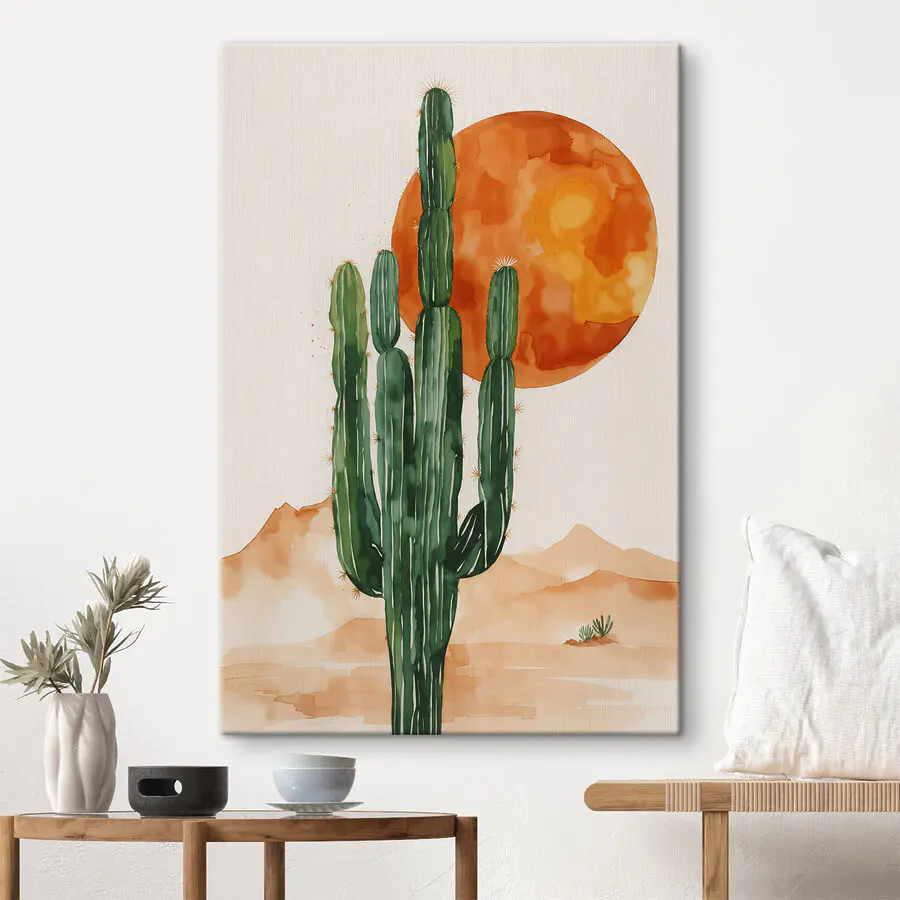 Stel je voor dat je de warmte van de woestijn in huis haalt met deze levendige canvasprint! Met een speelse cactus die naar de hemel reikt onder een felle zon, is het een vrolijke herinnering dat zelfs stekelige dingen kunnen gedijen. Zie het voor je in een zonnig hoekje, misschien in de buurt van een comfortabele stoel, uitnodigend om koffie te drinken en te dagdromen. Elke blik wekt een beetje reislust op, waardoor je het gevoel krijgt dat je in een zonovergoten avontuur verwikkeld bent. Perfect om elke ruimte op te fleuren, dit stuk serveert een stukje schoonheid van de natuur en voegt een unieke draai toe aan je inrichting. Dus waarom zou je deze cactus niet een beetje vreugde en kleur aan je muren laten brengen?