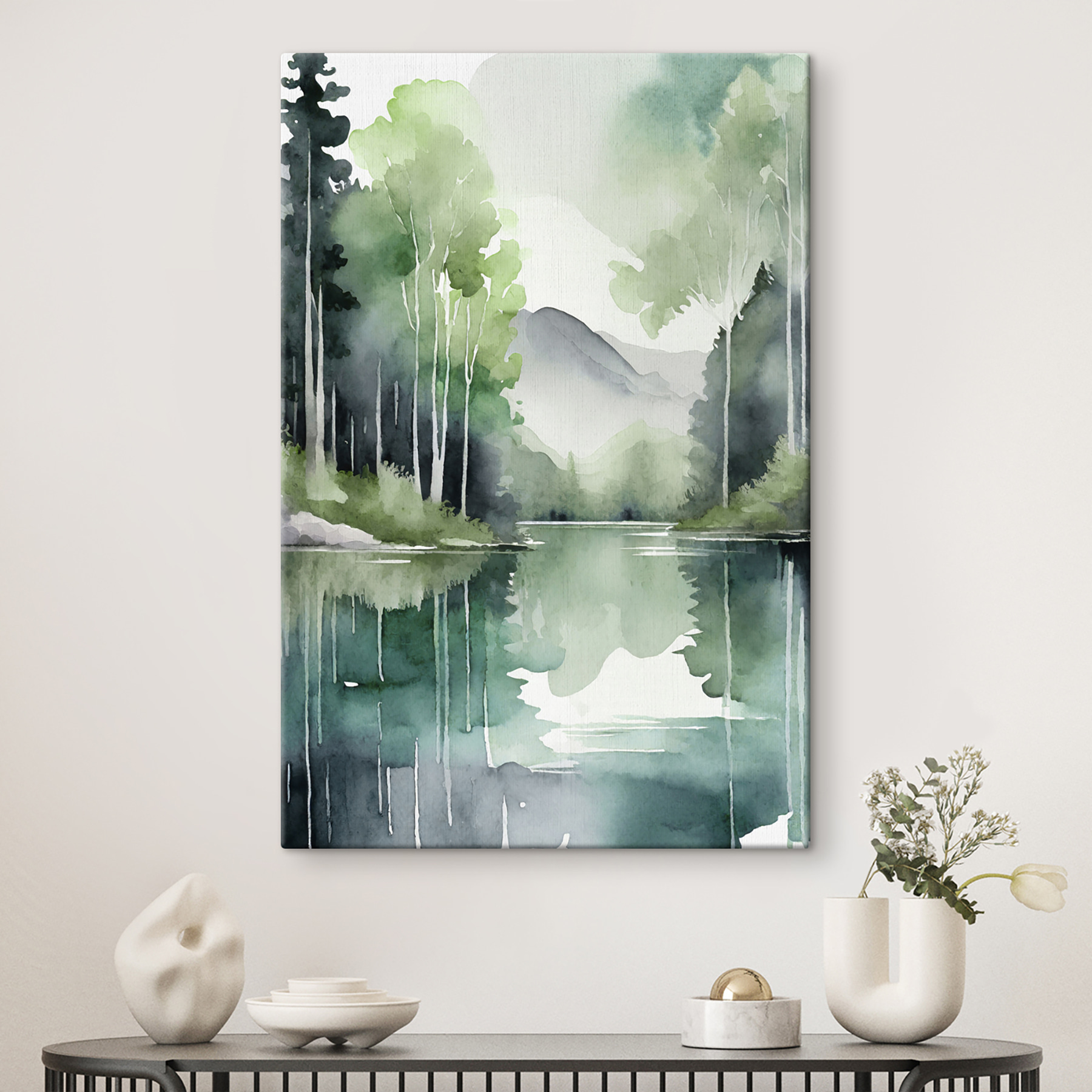 Stel je voor dat je dit prachtige canvas aan je muur hebt hangen – een aquarelschilderij van een sereen meer tussen bomen en bergen. Het is alsof de natuur speciaal voor jou op “pauze” is gezet. Kun je het zachte ruisen van de bladeren en het zachte druppelen van het water niet horen? Serieus, het is eigenlijk een diepe ademhaling in beeldvorm. Perfect voor iedereen die graag een beetje van het buitenleven naar binnen haalt. Je zou wel eens kunnen dagdromen over weekendwandelingen of het plannen van de kampeertocht van de volgende zomer. Het is niet alleen kunst, het is een mini-vakantie in je woonkamer. Richt je kamer in en voel je stress wegsmelten telkens als je er even naar kijkt. Dat is nog eens muurtherapie!