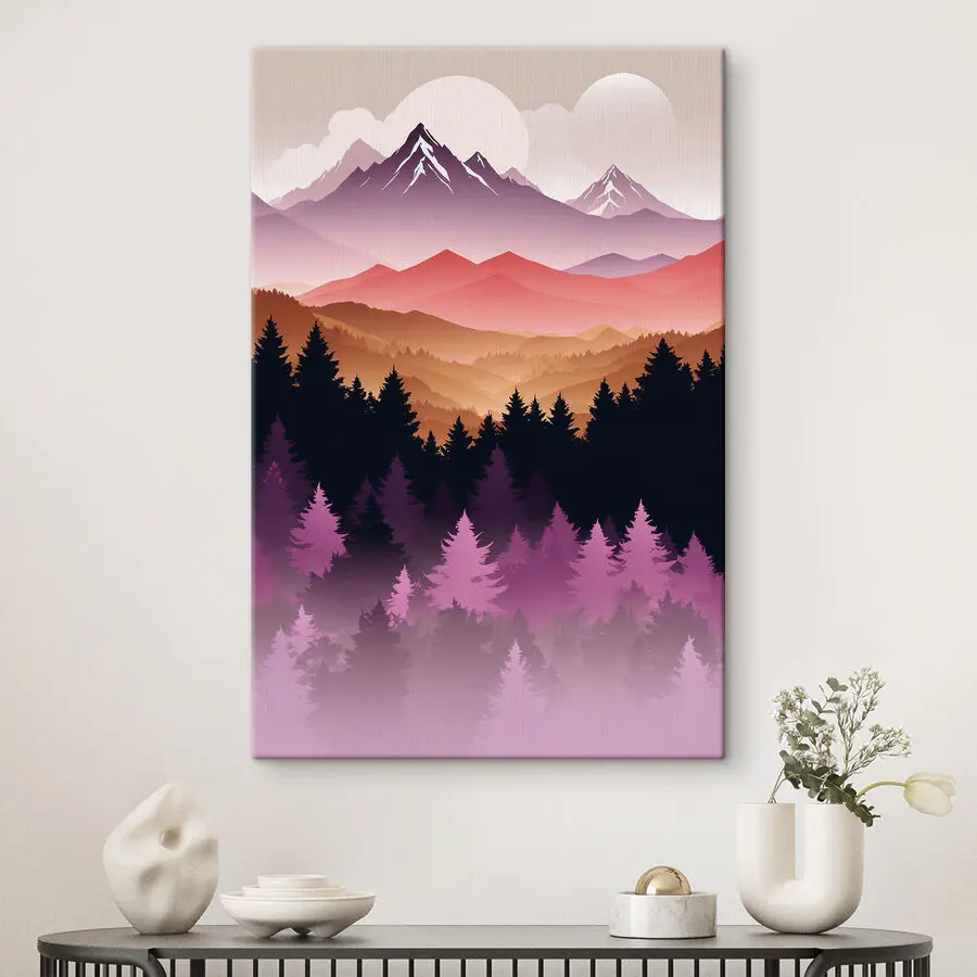 Stel je voor dat je na een lange dag thuiskomt en begroet wordt door deze prachtige canvasprint – bergen die sereniteit uitstralen en bomen die de wacht houden. Het is als een stille bewaker van kalmte voor je ruimte. De levendige tinten van de zonsondergang (of misschien zonsopgang?) trekken je meteen naar binnen. Perfect voor iedereen die van de natuur houdt, maar de bomen niet naar binnen kan lokken. Zie het voor je boven je bank of in een gezellig leeshoekje, waar het misschien wel wat reislust opwekt – zonder insectenspray. Een stukje vredige wildernis aan je muur.