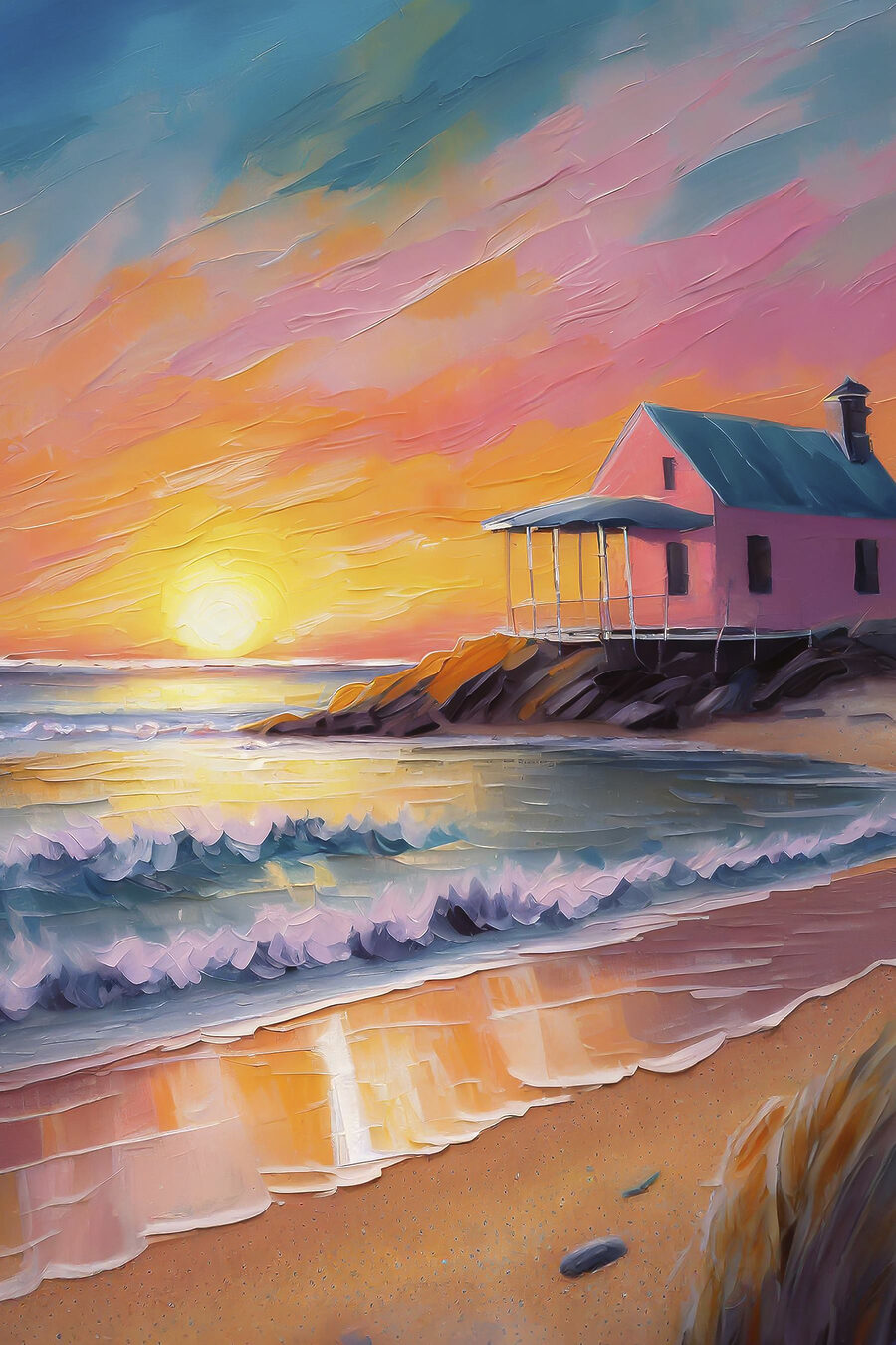 Stel je een gezellig huis aan het strand voor, badend in de warme gloed van een zonsondergang! Deze canvasprint legt precies dat dromerige moment vast. Perfect voor iedereen die een vleugje strandstilte in zijn ruimte wil brengen. De zachte golven die het strand oprollen laten je bijna het gefluister van de oceaan horen. Hang het in je woon- of slaapkamer en waan je elke dag op een minivakantie – zonder het zand in je schoenen. Het voegt een vleugje kleur en een snufje magie toe aan elke muur. Gegarandeerd een zalig gevoel!