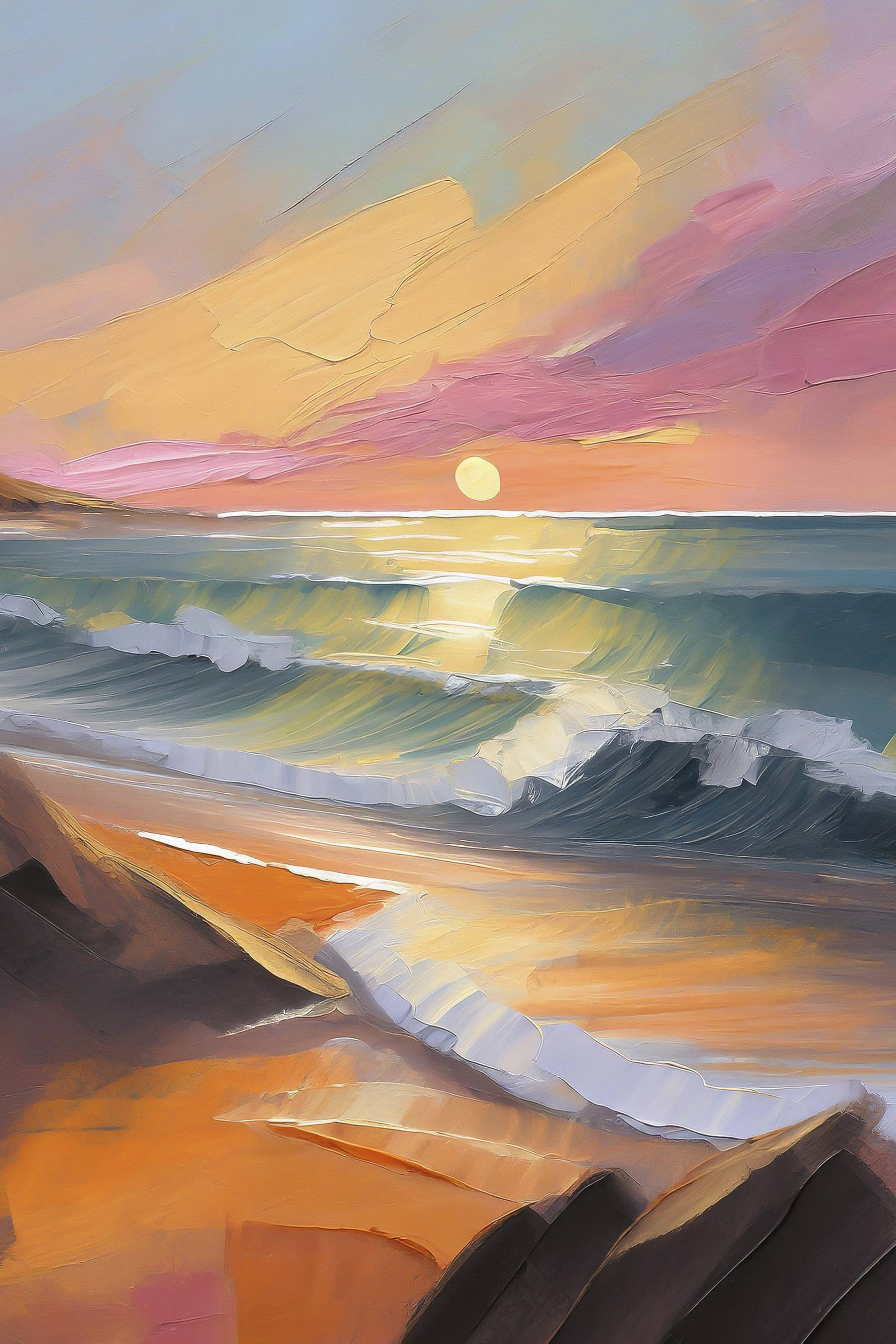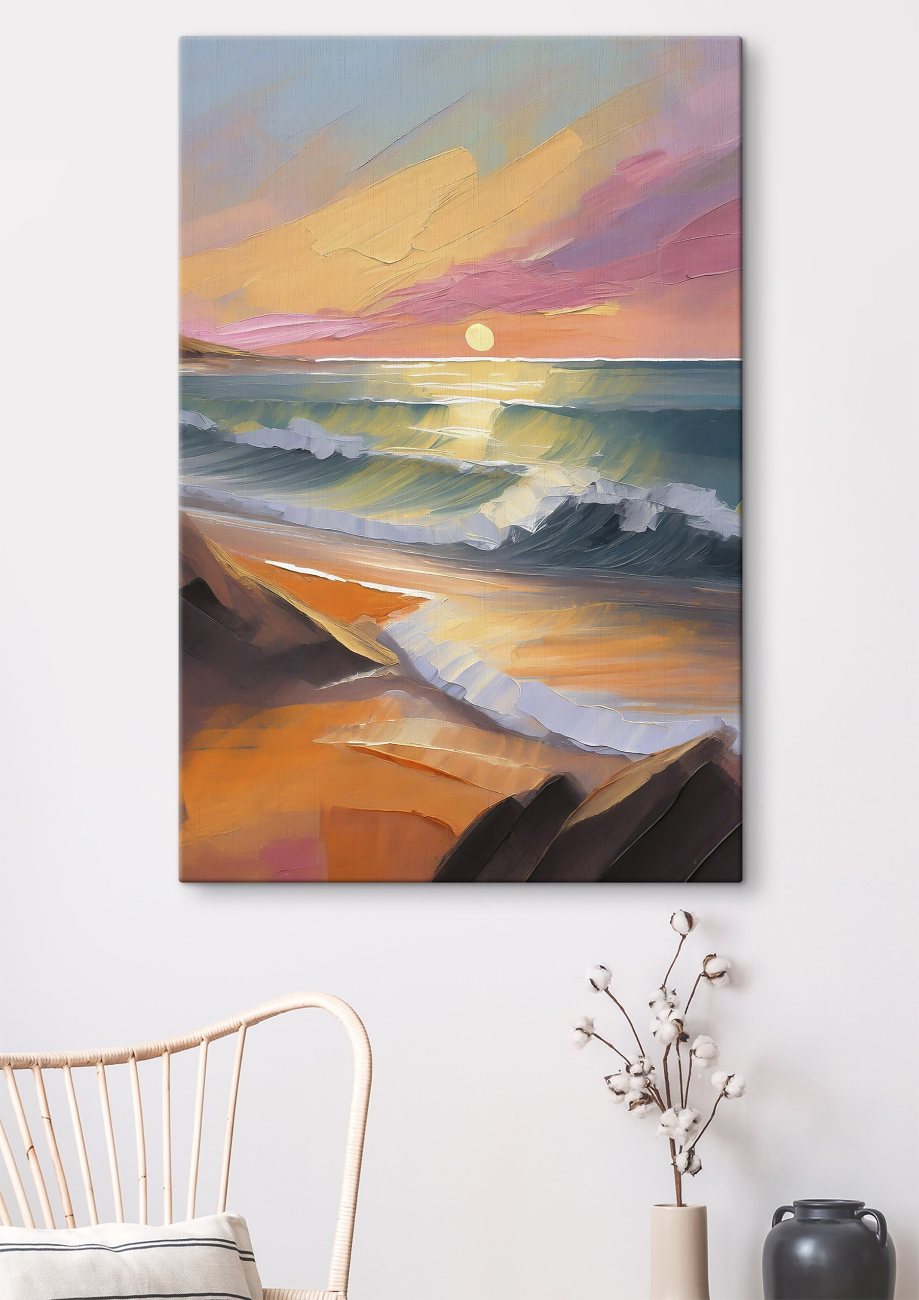 Stel je voor: je hebt een lange dag achter de rug, je leunt achterover in je favoriete stoel en vlak voor je hangt een betoverend doek van een strand bij zonsondergang. Die golven, geschilderd met zulke levendige streken, lijken bijna oceaangeheimen te fluisteren. De lucht, een explosie van roze en oranje, voelt aan als het vuurwerk van de natuur zelf. Het is niet zomaar kunst; het is een minivakantie. Het is perfect om een serene sfeer te creëren en het zou zelfs je kamerplanten het gevoel kunnen geven dat ze op vakantie zijn. Alle zen, zonder zand in je schoenen!
