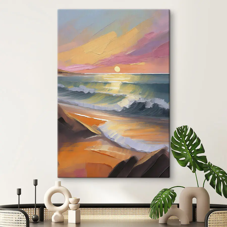 Stel je voor: je hebt een lange dag achter de rug, je leunt achterover in je favoriete stoel en vlak voor je hangt een betoverend doek van een strand bij zonsondergang. Die golven, geschilderd met zulke levendige streken, lijken bijna oceaangeheimen te fluisteren. De lucht, een explosie van roze en oranje, voelt aan als het vuurwerk van de natuur zelf. Het is niet zomaar kunst; het is een minivakantie. Het is perfect om een serene sfeer te creëren en het zou zelfs je kamerplanten het gevoel kunnen geven dat ze op vakantie zijn. Alle zen, zonder zand in je schoenen!