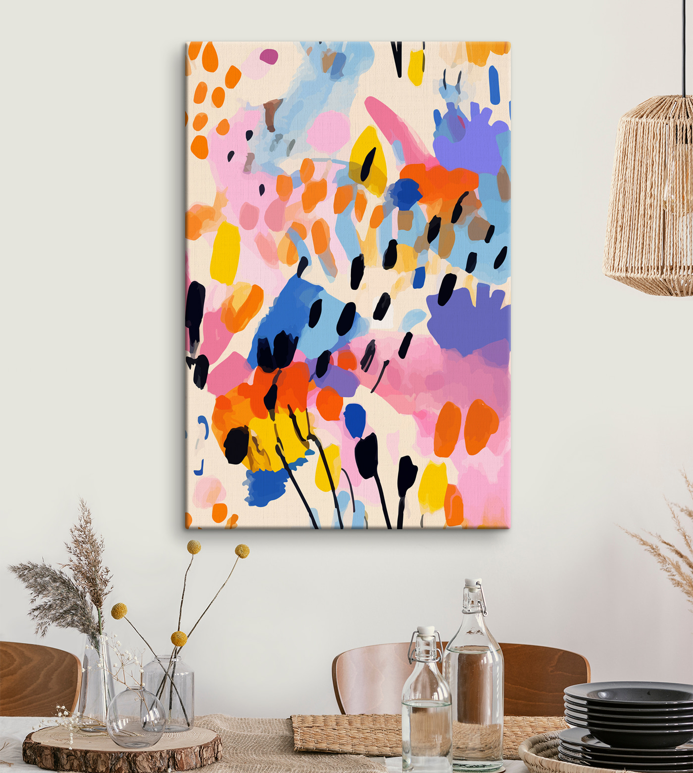 Stel je voor dat je dit levendige abstracte canvas op je muur plopt – het is alsof je een carnaval van kleuren in je ruimte loslaat! Deze levendige print bestaat uit spetters en streepjes van heldere tinten die samen dansen als een wild feest. Perfect om die energiestoot toe te voegen, waardoor je kamer aanvoelt alsof hij barst van de creativiteit. De speelse mix van vormen en tinten voelt op de een of andere manier rustig en toch chaotisch aan – een soort georganiseerde puinhoop die gewoon leuk is om naar te kijken. Het is niet alleen kunst, het is een ervaring. Of je nu koffie drinkt of gewoon chillt, je zult steeds weer nieuwe kleine details vinden om over te glimlachen. Hou je van een goed gesprek? Dit canvas maakt mensen aan het praten – het is een vleugje vrolijkheid, perfect voor iedereen die houdt van een vleugje onverwacht in zijn of haar interieur.