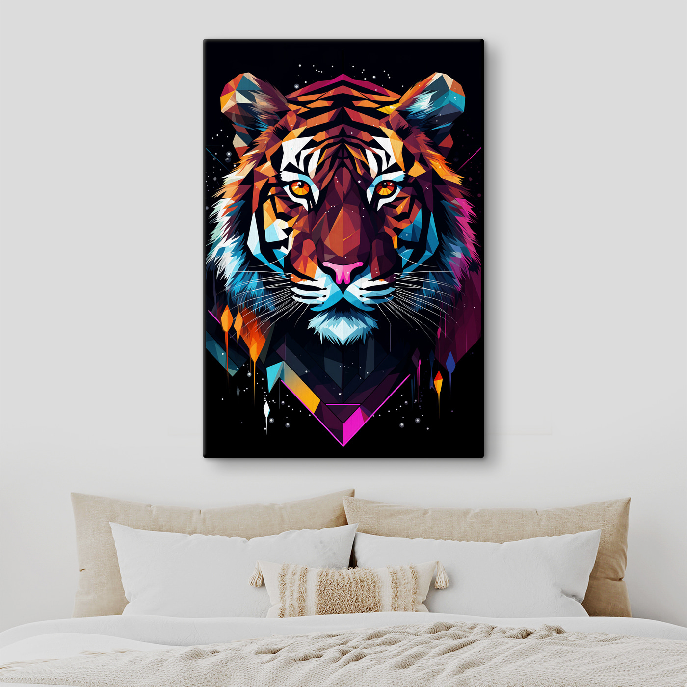 Hang hem in je woonkamer, slaapkamer of zelfs je kantoor en laat de oranje, blauwe en roze tinten elke muur tot leven brengen. Zie het als je persoonlijke waaktijger, met een vleugje neonlicht. Elke blik erop zal een kleine uitbarsting van vreugde en een lichte rilling over je rug brengen… op een goede manier, natuurlijk. Het is meer dan alleen kunst, het is een gespreksstarter, een instant sfeermaker en het perfecte stuk voor iedereen die een beetje wild van hart is. Dus voeg een vleugje ongetemde schoonheid toe aan je huis!