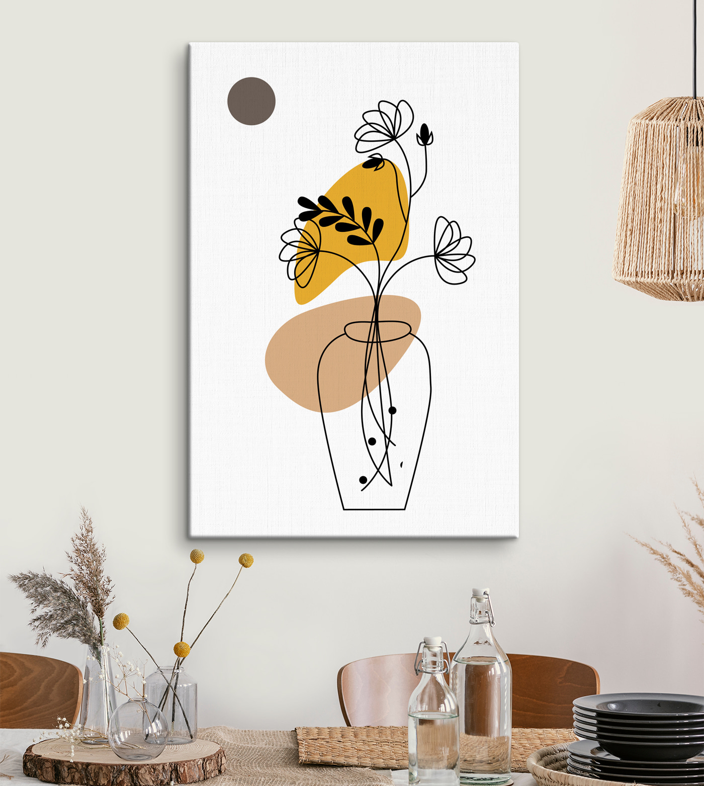 Ooit een bloementekening gezien die aanvoelt als een warme knuffel? Dat is precies hoe deze canvasprint, “Tekening van bloemen in een vaas”, eruitziet. Het heeft een coole boho vibe, met eenvoudige lijnen en warme kleuren die je doen denken aan een zonnige middag. Perfect voor wie een beetje natuur binnenshuis wil, maar zonder hooikoorts. Stel het je voor in je woonkamer – het fleurt de ruimte meteen op, toch? Het is het soort kunst dat je doet glimlachen wanneer je er langs loopt, misschien zelfs dagdromen over een vredige weide. Een schot in de roos voor elke boho, bloemliefhebbende, kunstminnende ziel die er is.