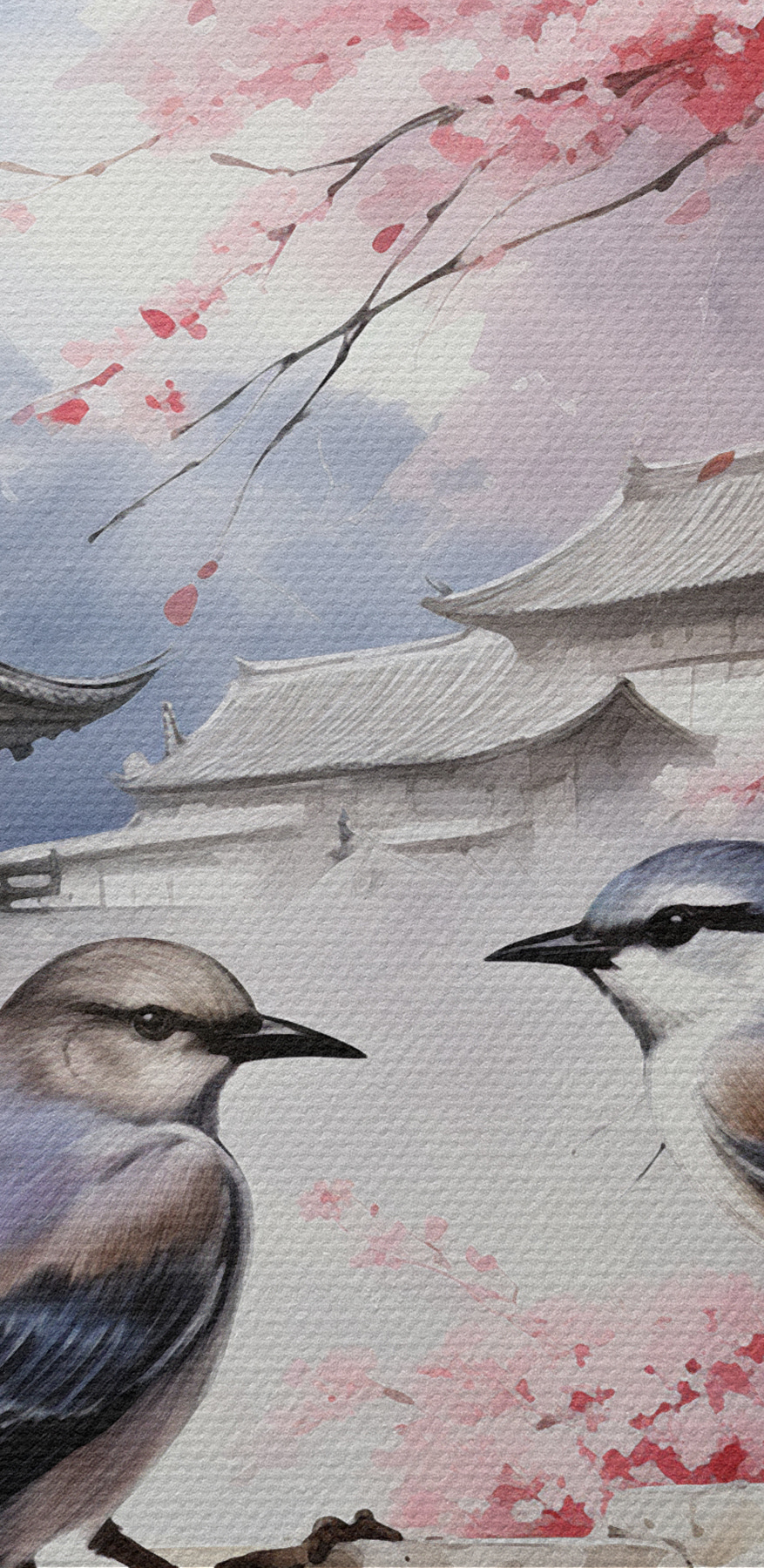Transformeer je ruimte met deze fascinerende canvasprint met twee charmante vogels op een verweerde muur. Het is als een stukje natuur bij je thuis, dat fluisteringen van sereniteit in je dag brengt. Stel je voor dat je ‘s ochtends aan je koffie nipt terwijl je verdwaalt in de delicate tinten van de kersenbloesems en de rustieke architectuur in de verte – ze geven je het gevoel alsof je een vredige wandeling in Japan maakt, toch? Dit stuk is perfect voor het toevoegen van een zacht tintje aan elke kamer, het stimuleren van vreugde en misschien zelfs een glimlach. Bovendien is het geweldig voor momenten waarop je gewoon even naar iets moois wilt staren en je gedachten wilt laten afdwalen (wat we allemaal wel eens doen). Een mooie manier om de eenvoudige genoegens van het leven centraal te stellen.