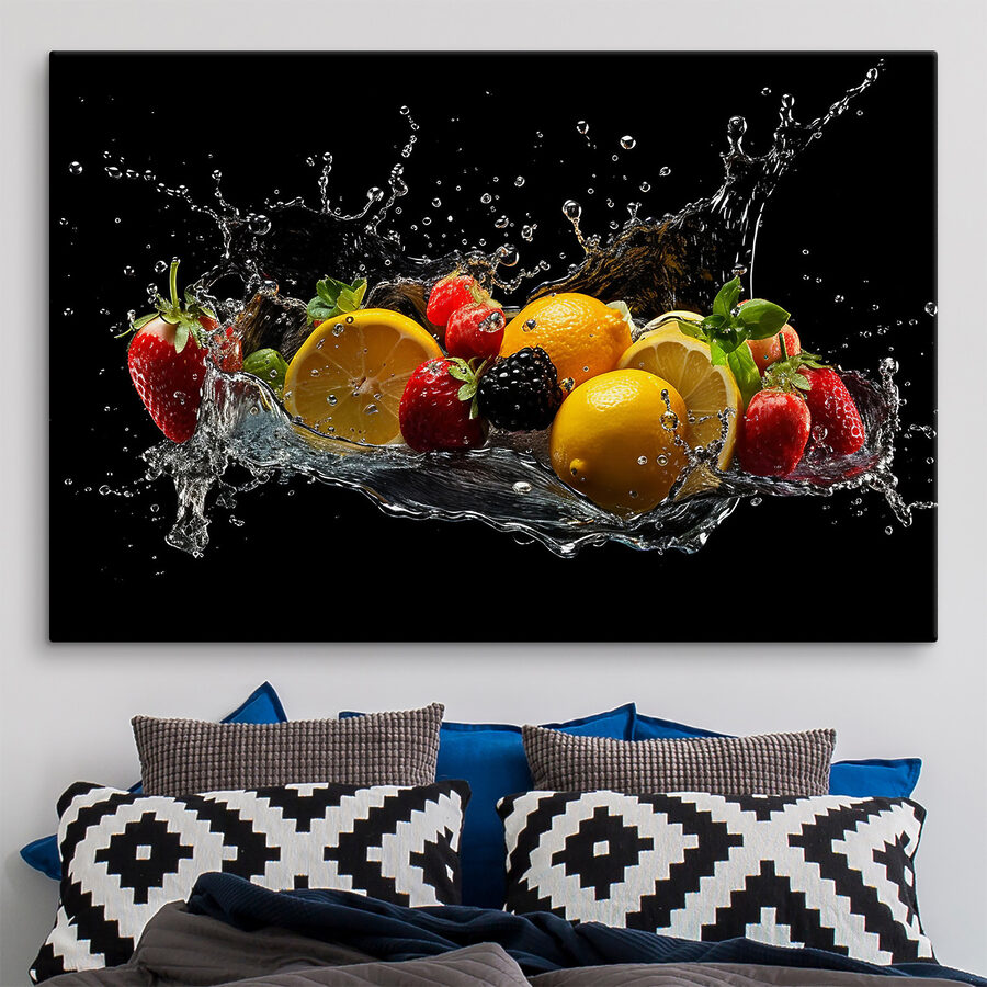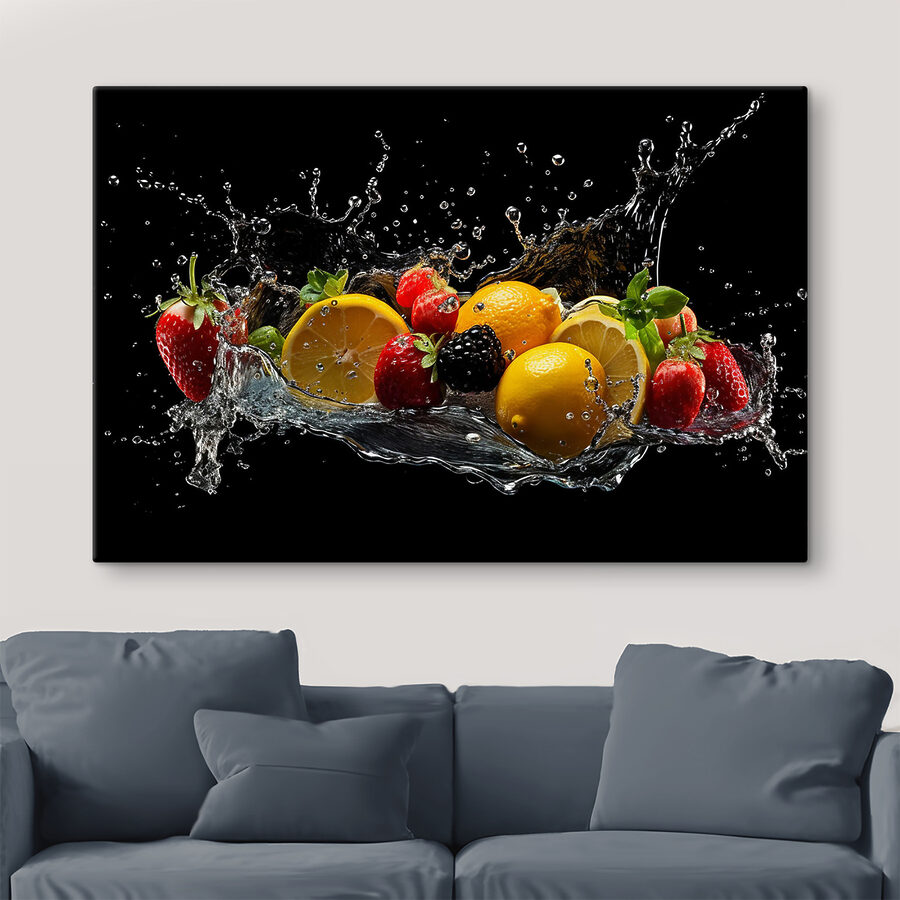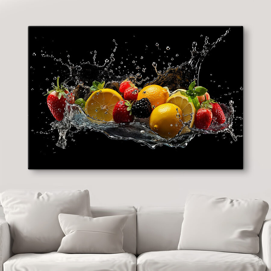 Spetter in levendige kleuren met deze opvallende canvasprint met vruchten die dansen in een plens water! Het is een speels stuk, perfect voor in de keuken of eethoek, dat een uitbarsting van energie en een vleugje plezier toevoegt. Zie het al aan je muur hangen en verander alledaagse maaltijden in een fruitige fiesta. Vrienden zullen misschien wel opmerken dat ze zich frisser voelen – wie zou er niet geïnspireerd raken door een spetterende citroen of een brutale aardbei? Het is alsof je een levendige tuin hebt zonder het onderhoud – alleen vrolijke vibes en een vleugje natuur binnenshuis!