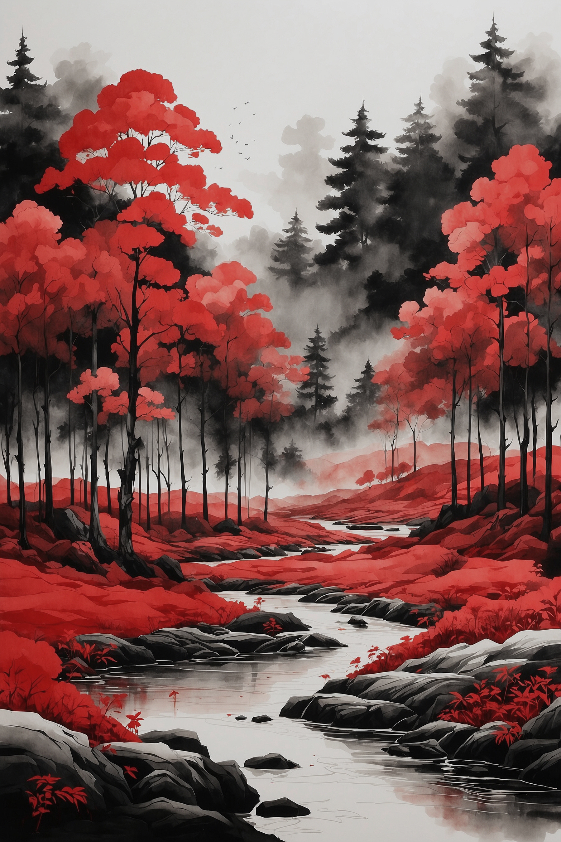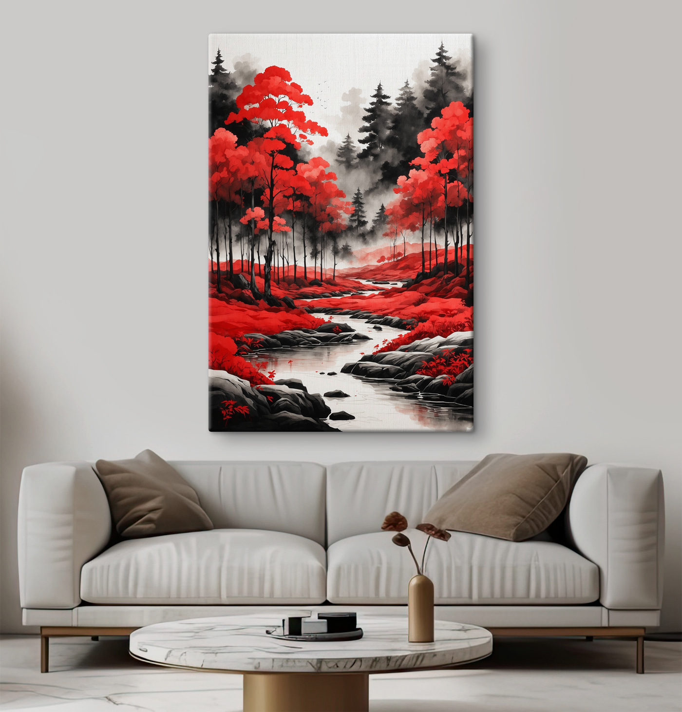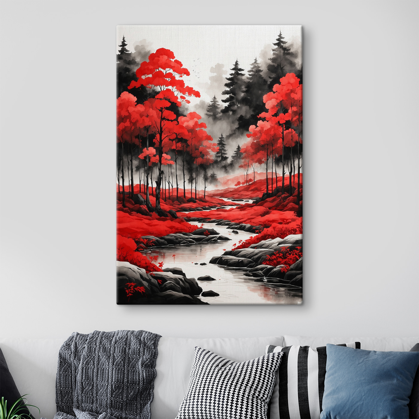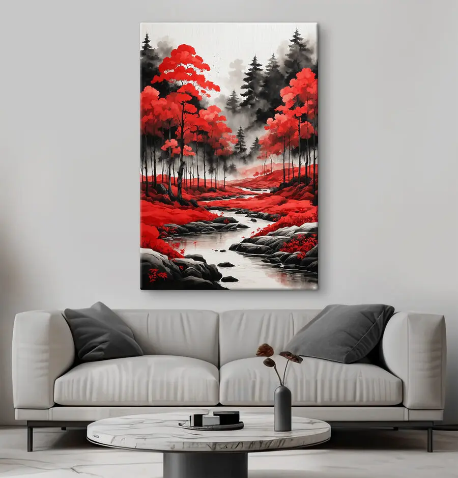 Ooit het gevoel gehad dat je muren wel wat “oomph” kunnen gebruiken? Kijk dan eens naar deze canvasprint getiteld “River Running Through a Forest”. Serieus, het is alsof je vanuit je woonkamer een sprookje binnenstapt. Die dieprode en zwarte tinten? Ze trekken je naar binnen, nietwaar? Stel je voor dat je tot rust komt na een lange dag, geniet van een kopje thee en verdwaal in dit rustgevende tafereel. Het is niet alleen natuur, het is natuur met een beetje drama, waardoor elke kamer een beetje magischer aanvoelt. Klaar om je kamer op te knappen? Deze schoonheid roept je naam.