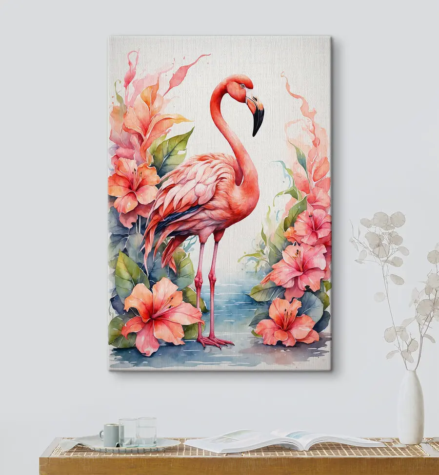 Voel je je een beetje wild? Maak kennis met je nieuwe favoriete canvasprint, “Painting of a Flamingo”. Deze schoonheid is niet zomaar een muurdecoratie, het is een meesterwerk dat je meteen meeneemt naar een weelderig, tropisch paradijs. Stel je eens voor dat je na een lange dag thuiskomt bij die roze flamingo tussen de levendige bloemen – echt, het is net een minivakantie aan je muur!