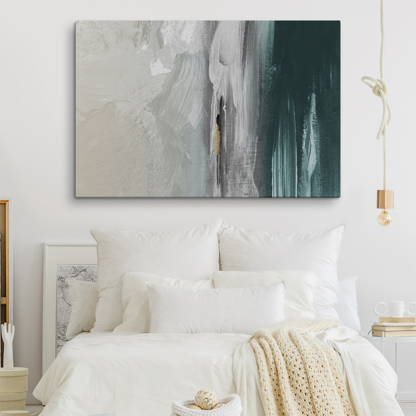Transformeer je kamer met deze prachtige canvasprint met abstracte penseelstreken in rustgevende wit- en groenblauwe tinten. Stel je voor dat je een kamer binnenloopt en je voelt meteen een golf van rust – dit kunstwerk heeft dat effect. Het is als de oceaan op een perfecte dag, die zoete woordjes fluistert tegen je muren. Dit kunstwerk is perfect voor een loft of een andere ruimte die een vleugje creativiteit nodig heeft, het nodigt uit tot een gesprek en inspireert tot dagdromen. Of het nu boven een gezellige bank hangt of in een speciale kunsthoek, het zal zeker hoofden doen omdraaien en vreugde opwekken. Wie wist dat woondecoratie zo verfrissend kon zijn?