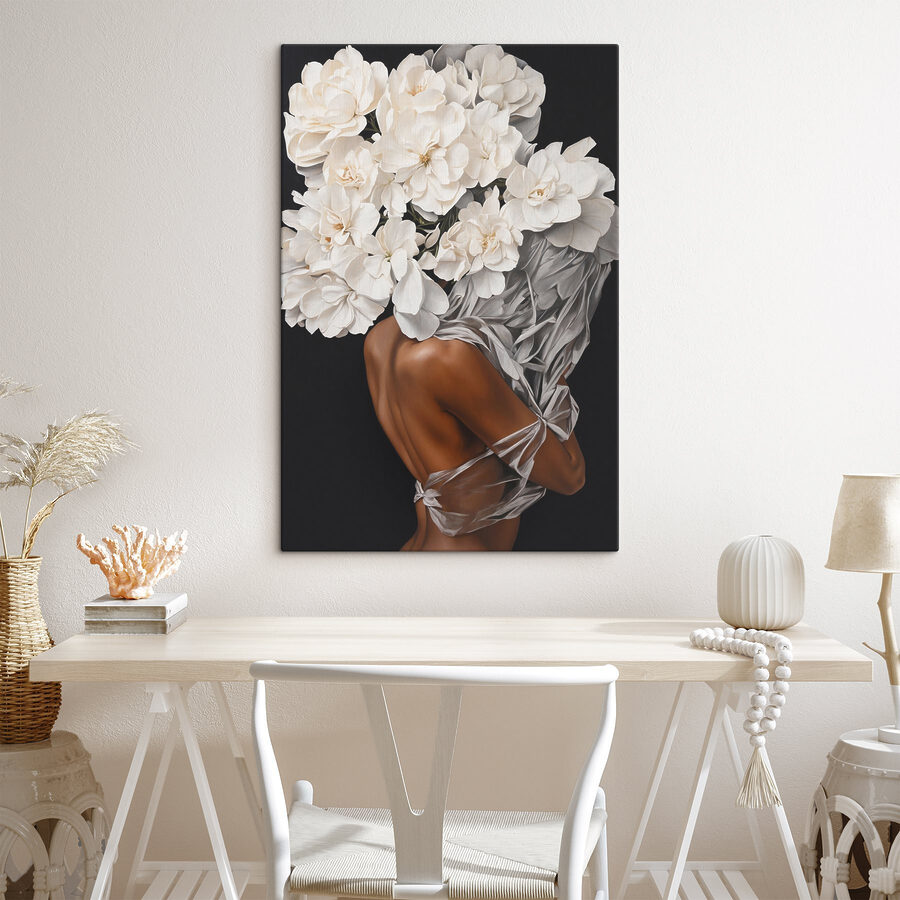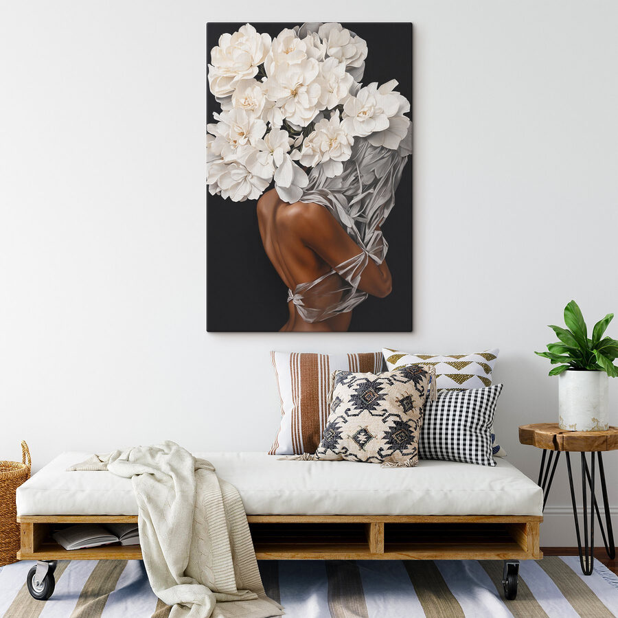 Stel je voor dat je na een lange dag je woonkamer binnenloopt en dit aan je muur ziet hangen – onmiddellijk rustgevend, toch? “Blossoms in graceful embrace” is meer dan zomaar een canvasprint. Dit kunstwerk combineert de delicate schoonheid van roomwitte bloesems met de subtiele elegantie van een figuur gewikkeld in een zijden gordijn. Het is als een fluistering van de lente die moeiteloos elke kamer verzacht. Vrienden die op bezoek komen, zullen waarschijnlijk meteen hun eigen bloemenkunstwerk plannen. Voeg het toe aan je ruimte voor een vleugje gratie en een beetje ‘wow-factor’ die nooit faalt om indruk te maken.