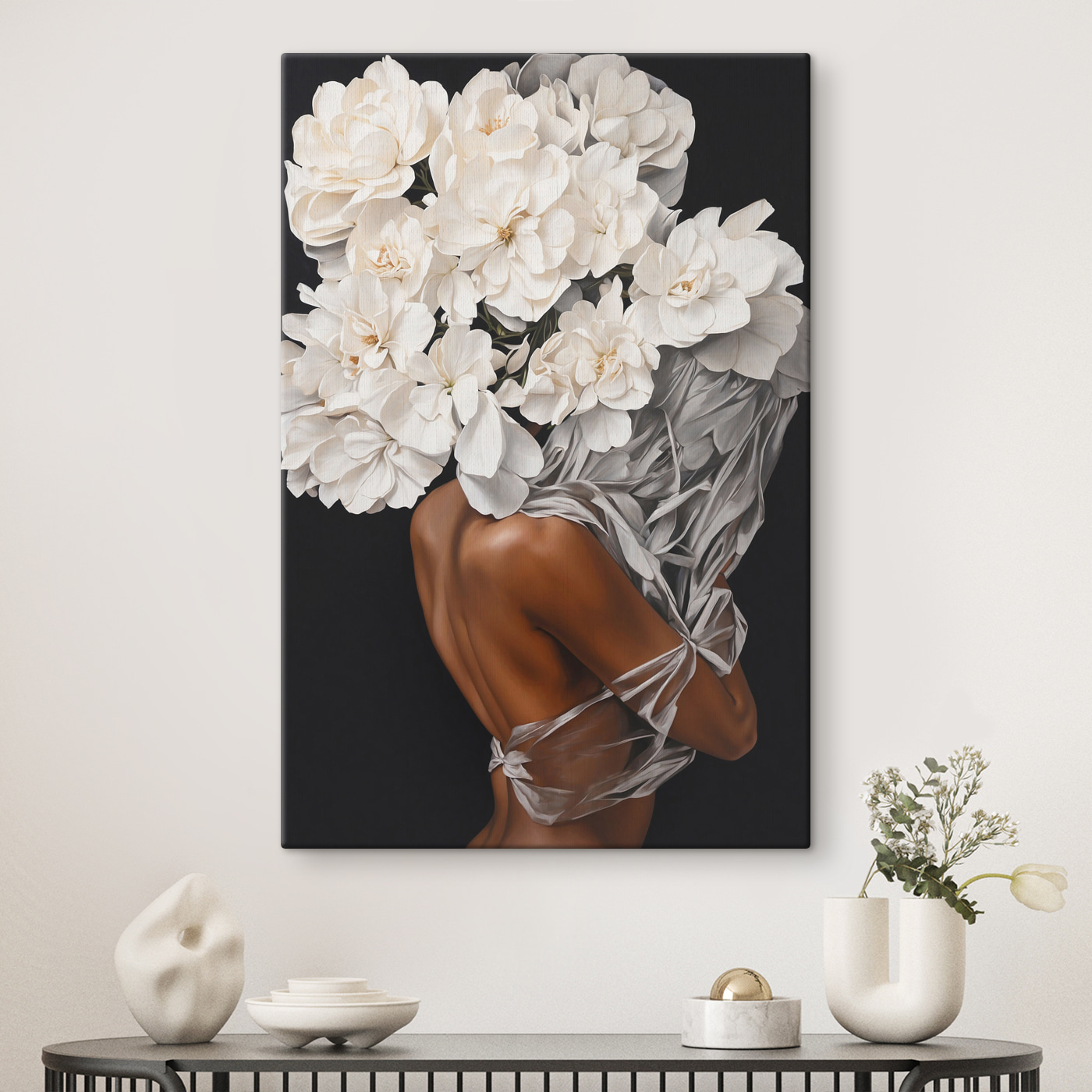 Stel je voor dat je na een lange dag je woonkamer binnenloopt en dit aan je muur ziet hangen – onmiddellijk rustgevend, toch? “Blossoms in graceful embrace” is meer dan zomaar een canvasprint. Dit kunstwerk combineert de delicate schoonheid van roomwitte bloesems met de subtiele elegantie van een figuur gewikkeld in een zijden gordijn. Het is als een fluistering van de lente die moeiteloos elke kamer verzacht. Vrienden die op bezoek komen, zullen waarschijnlijk meteen hun eigen bloemenkunstwerk plannen. Voeg het toe aan je ruimte voor een vleugje gratie en een beetje ‘wow-factor’ die nooit faalt om indruk te maken.