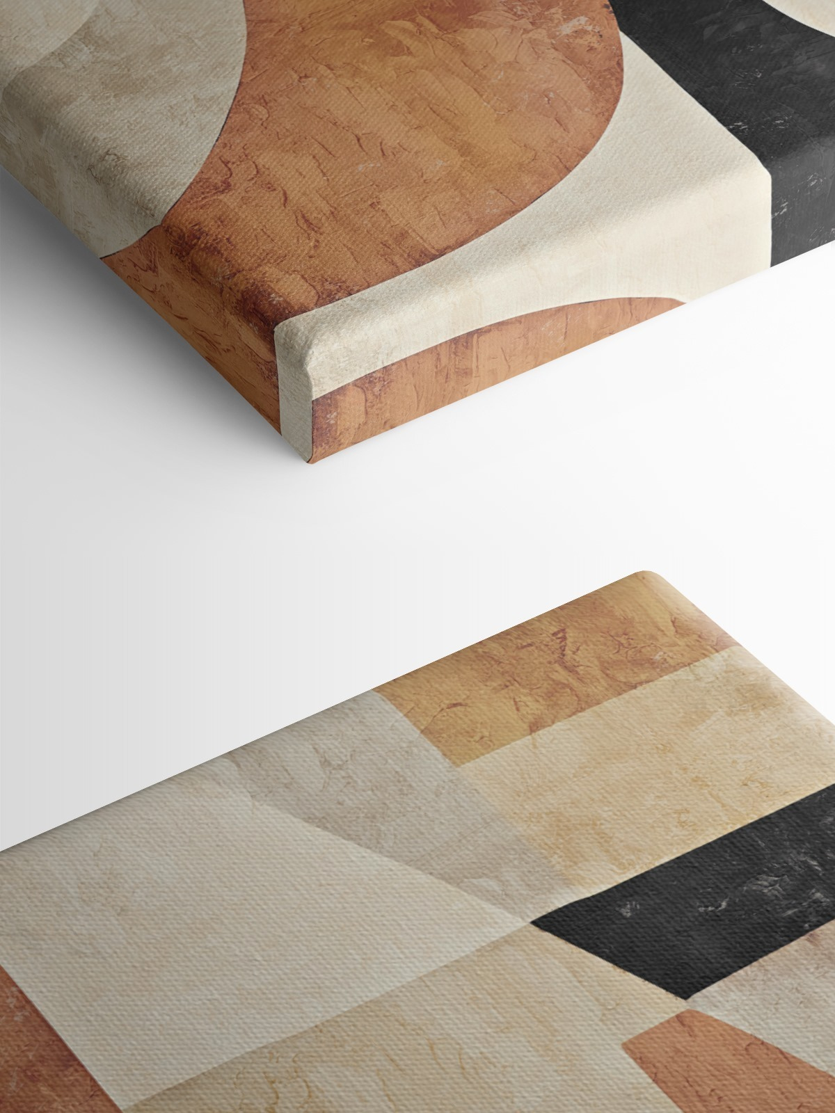 Een saaie muur omtoveren tot een prachtig middelpunt is eenvoudig met deze minimalistische canvas. Stel je voor dat het boven een gezellige bank hangt en moeiteloos je ruimte samenbrengt. Het rustgevende palet van warme tinten en geometrische vormen nodigt uit tot warmte, waardoor elke kamer gezelliger aanvoelt. Het is als een troostende knuffel voor je muren. Als je ernaar kijkt, kun je zelfs inspiratie opdoen terwijl je koffie drinkt of door een boek bladert. Bovendien is het veelzijdig genoeg om bij elke sfeer te passen, of die nu modern, boho of een beetje eclectisch is. Perfect om karakter toe te voegen zonder te roepen, “Kijk naar mij!” – want soms heeft subtiliteit zijn charme.