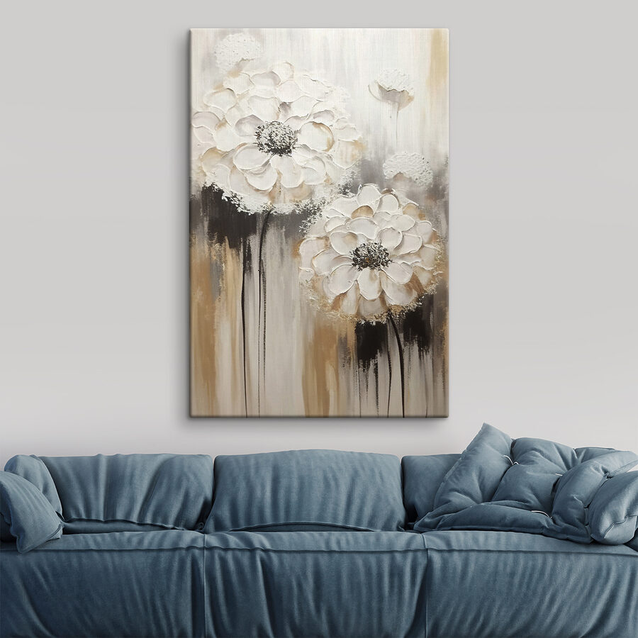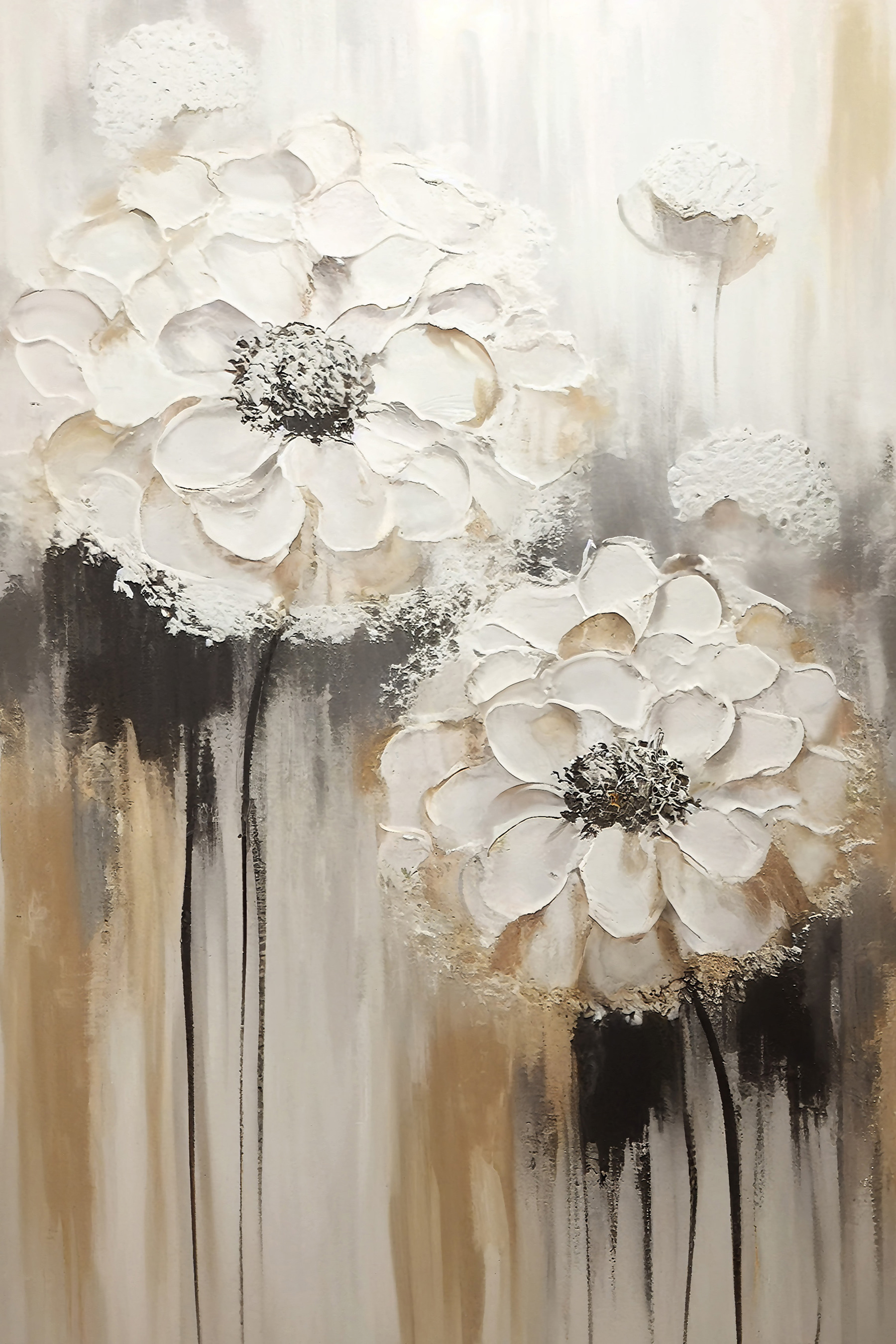 Loop je wel eens een kamer binnen en heb je het gevoel dat er iets ontbreekt? Misschien is het wel het perfecte kunstwerk om alles bij elkaar te brengen. “Schilderij van witte bloemen” is precies dat – eenvoudig maar prachtig. Grote, opvallende witte bloemen bloeien tegen een achtergrond die een dromerige mix is van zachte tinten. Deze bloemblaadjes lijken bijna te dansen. Stel je voor dat deze schoonheid in je woonkamer hangt, waardoor het sereen en uitnodigend aanvoelt. Het is alsof je een stukje van een vredige tuin in huis hebt. Kunstzinnig en toch rustgevend, het zal zeker ieders aandacht trekken en fluistert “Hé, blijf even”.