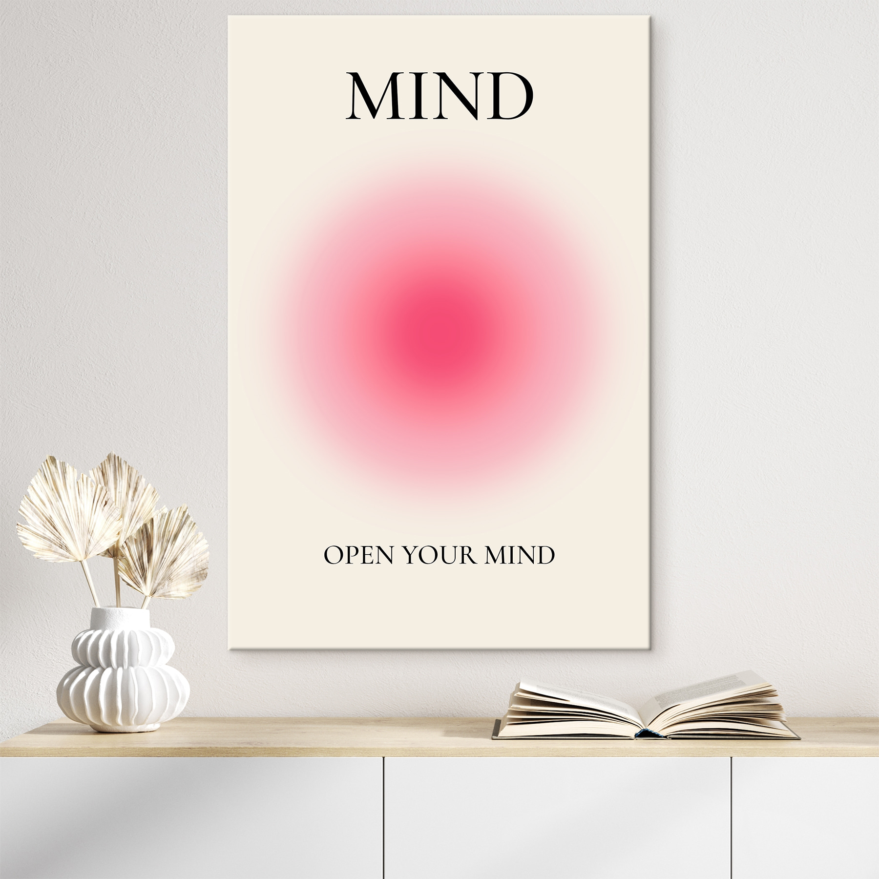 Stel je voor: je loopt je woonkamer binnen en bam! – daar staat deze opvallende canvasprint je aan te staren. Het strakke, eenvoudige ontwerp schreeuwt gewoon om verfijning. Zwarte letters op een frisse witte achtergrond – over een showstopper gesproken. Er staat “Mind” met daaronder “Open Your Mind”, omlijst door een zachte, stralende roze cirkel. Het is als een dagelijkse herinnering om nieuwsgierig te blijven, waardoor je ruimte zen en doordacht blijft aanvoelen.