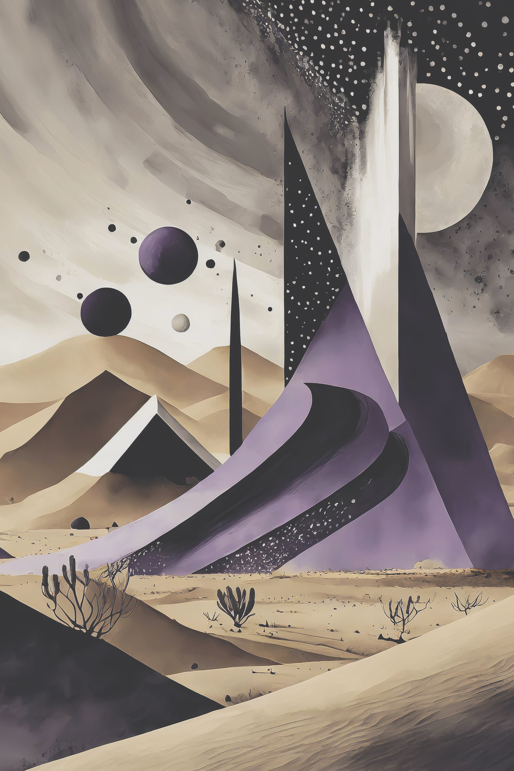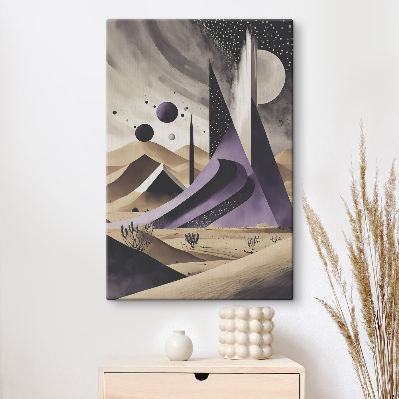 Stap in een dromerig landschap met deze canvasprint van “Plant in the Sand”. Stel je die zachte woestijnvibes voor, waar de zachte rondingen van duinen samenkomen met opvallende vormen die naar de sterren lijken te reiken. Het nodigt uit tot nieuwsgierigheid en een gevoel van verwondering, alsof het geheimen van het universum fluistert. Zie het al voor je in een gezellig leeshoekje of boven een minimalistisch bureau, dagdromen aanwakkerend terwijl je nipt van dat perfecte kopje koffie. De gedempte kleuren maken het gemakkelijk om te mengen met verschillende stijlen, dus of het nu modern chic of relaxte boho is, dit stuk voelt gewoon goed aan. Perfect voor wie houdt van de natuur met een twist, het transformeert elke plek zonder gedoe. Wie wist dat de woestijn er zo intrigerend uit kon zien?
