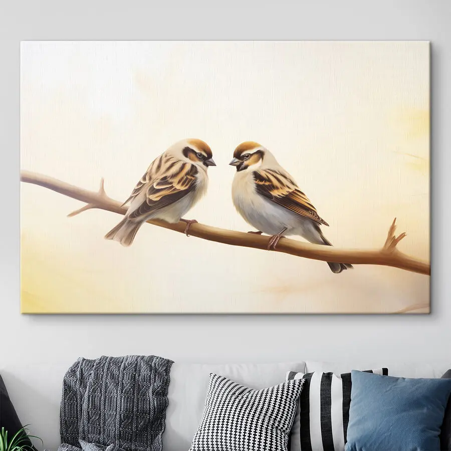 Bekijk deze prachtige canvasprint “Vogel zittend op een tak”. Het is perfect voor iedereen die van dieren houdt en een vleugje natuur aan zijn of haar interieur wil toevoegen. Stel je dit eens voor: twee schattige vogels chillen op een tak, koesterend in het zachte licht van een zonnige dag. Stel je voor dat je dit rustgevende tafereel op je muur hebt. Het is net alsof je een stukje rust in je kamer hebt.