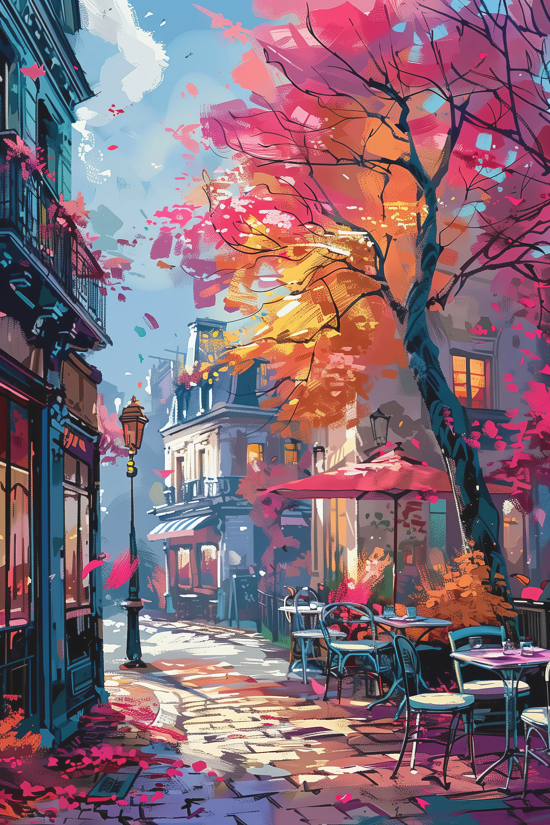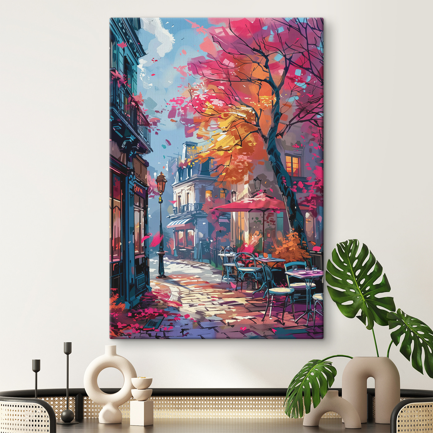 Stap in een gezellig tafereel dat verhalen van kille dagen en warme drankjes fluistert met deze prachtige canvasprint. Stel je een wandeling voor door een charmante straat met bomen in herfstkleuren, waarbij elk blad een verhaal vertelt. De uitnodigende cafés nodigen uit om plaats te nemen; het is de perfecte plek om iets zoets te drinken terwijl je mensen kijkt. De levendige aquarelstijl vangt die speelse dans tussen zomerse hitte en winterse kilte en verandert elke kamer in een knusse schuilplaats. Fleur die saaie muren op en laat je omarmen door de schoonheid van de herfst. Wie wil er nu niet een vleugje van die seizoensmagie in huis?