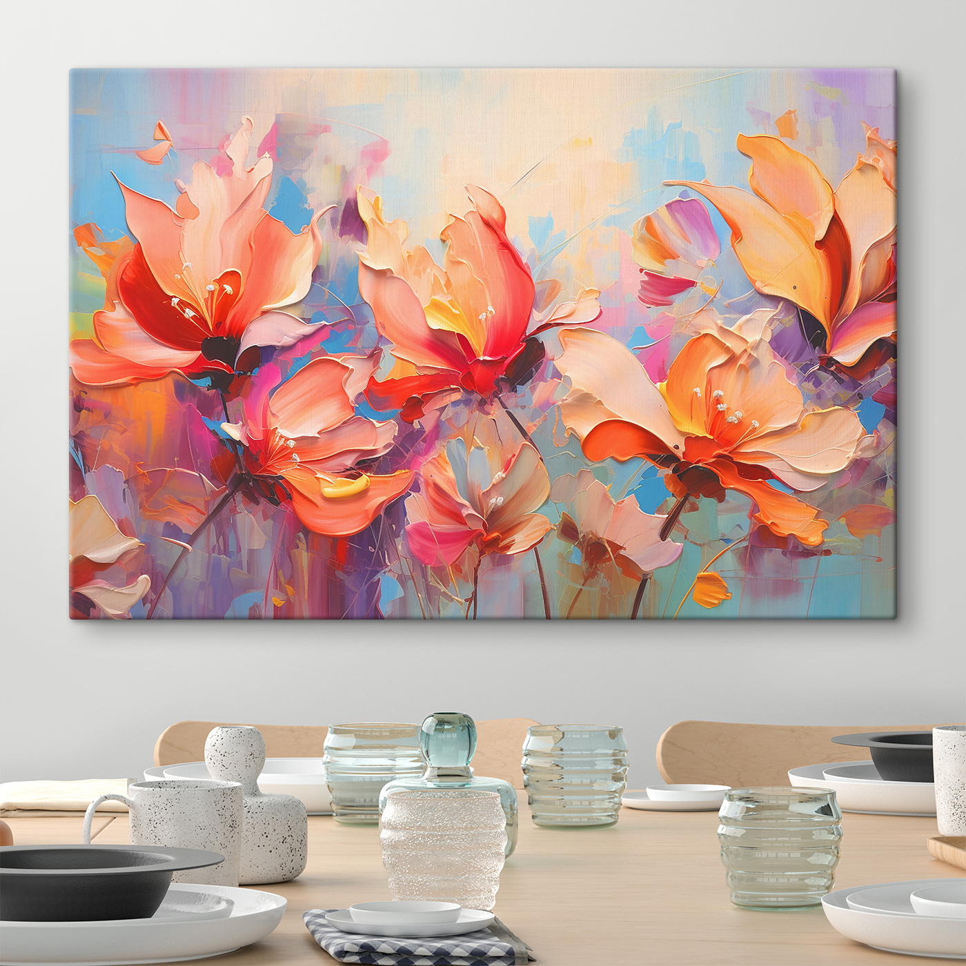 Stel je voor dat je thuiskomt met deze prachtige canvasprint van bloemen op een blauwe achtergrond – het is alsof het mooiste moment van de natuur speciaal voor jou is vastgelegd. Elke bloem barst van de levendige kleuren en lijkt bijna te dansen op het canvas. Dit is niet zomaar een kunstwerk; het is een vleugje vreugde dat warmte en troost uitstraalt.