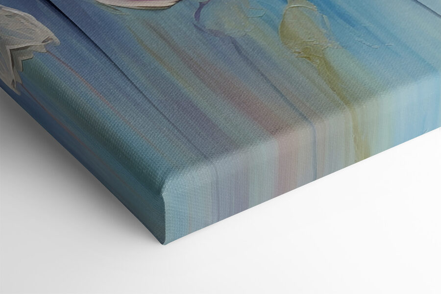 Stel je dit voor in je woonkamer – instant sfeermaker. Of misschien in de slaapkamer, voor een zachte, grillige sfeer. Deze bloesems zijn meer dan alleen kunst; ze zijn een mini-vakantie voor je ziel. Je zou jezelf kunnen betrappen op dagdromen of gewoon genieten van een rustigere, gelukkiger ruimte. Met zijn vrolijke mix van kleuren en rustgevende blauwe achtergrond is het net een dagelijkse herinnering dat schoonheid overal om ons heen bloeit. En hé, je hebt geen groene vingers nodig om deze bloemen mooi te houden!