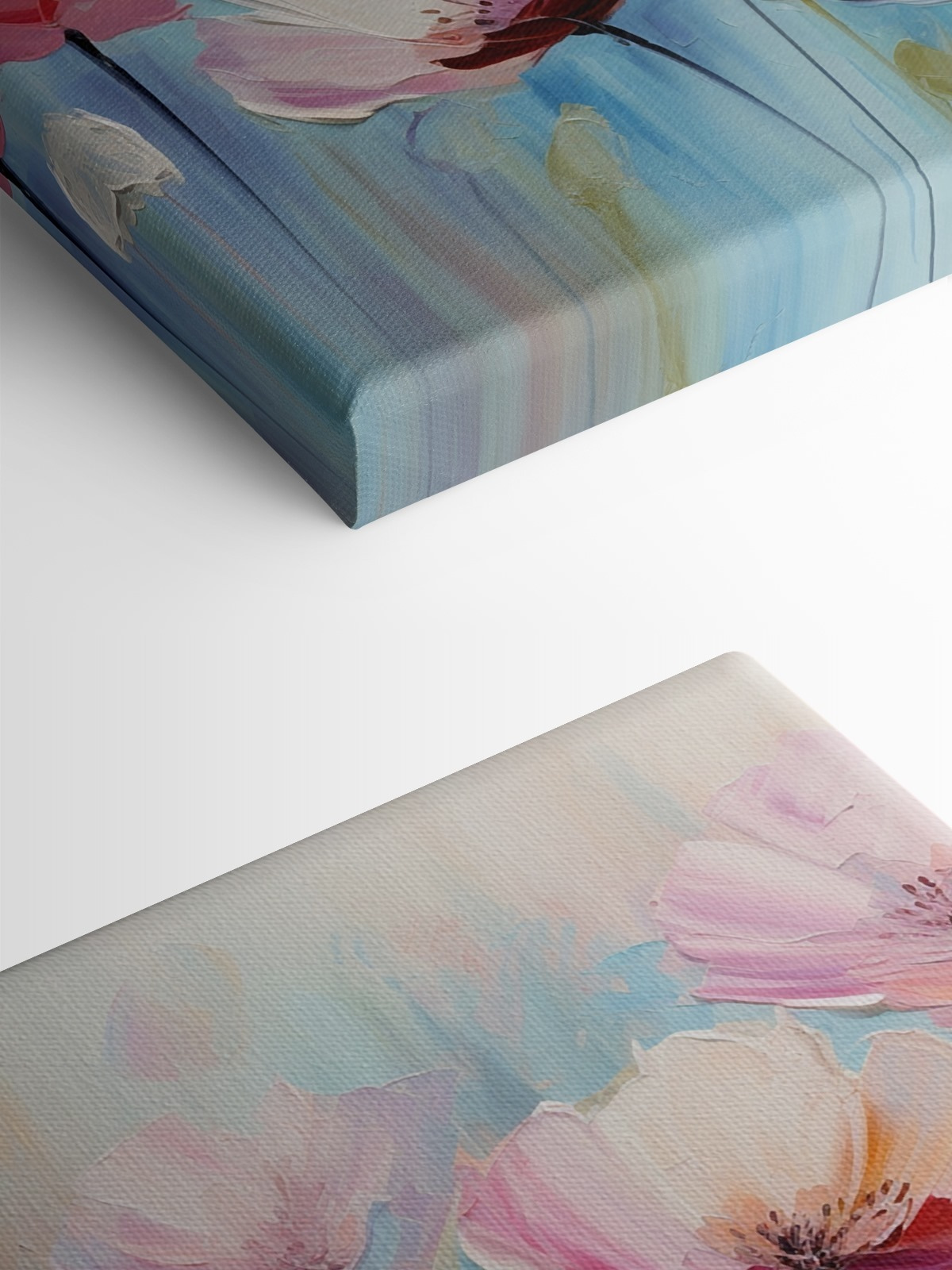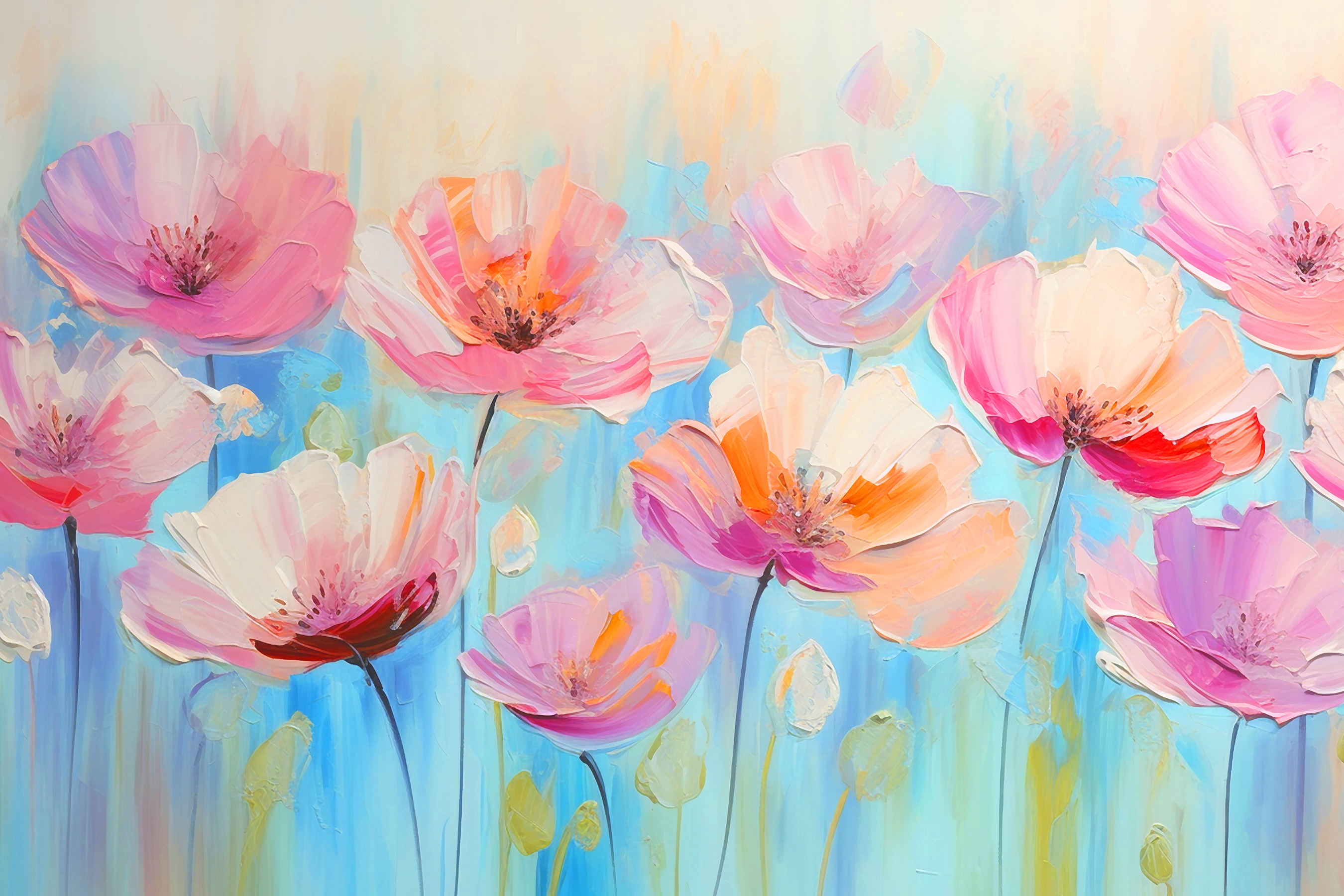 Stel je dit voor in je woonkamer – instant sfeermaker. Of misschien in de slaapkamer, voor een zachte, grillige sfeer. Deze bloesems zijn meer dan alleen kunst; ze zijn een mini-vakantie voor je ziel. Je zou jezelf kunnen betrappen op dagdromen of gewoon genieten van een rustigere, gelukkiger ruimte. Met zijn vrolijke mix van kleuren en rustgevende blauwe achtergrond is het net een dagelijkse herinnering dat schoonheid overal om ons heen bloeit. En hé, je hebt geen groene vingers nodig om deze bloemen mooi te houden!