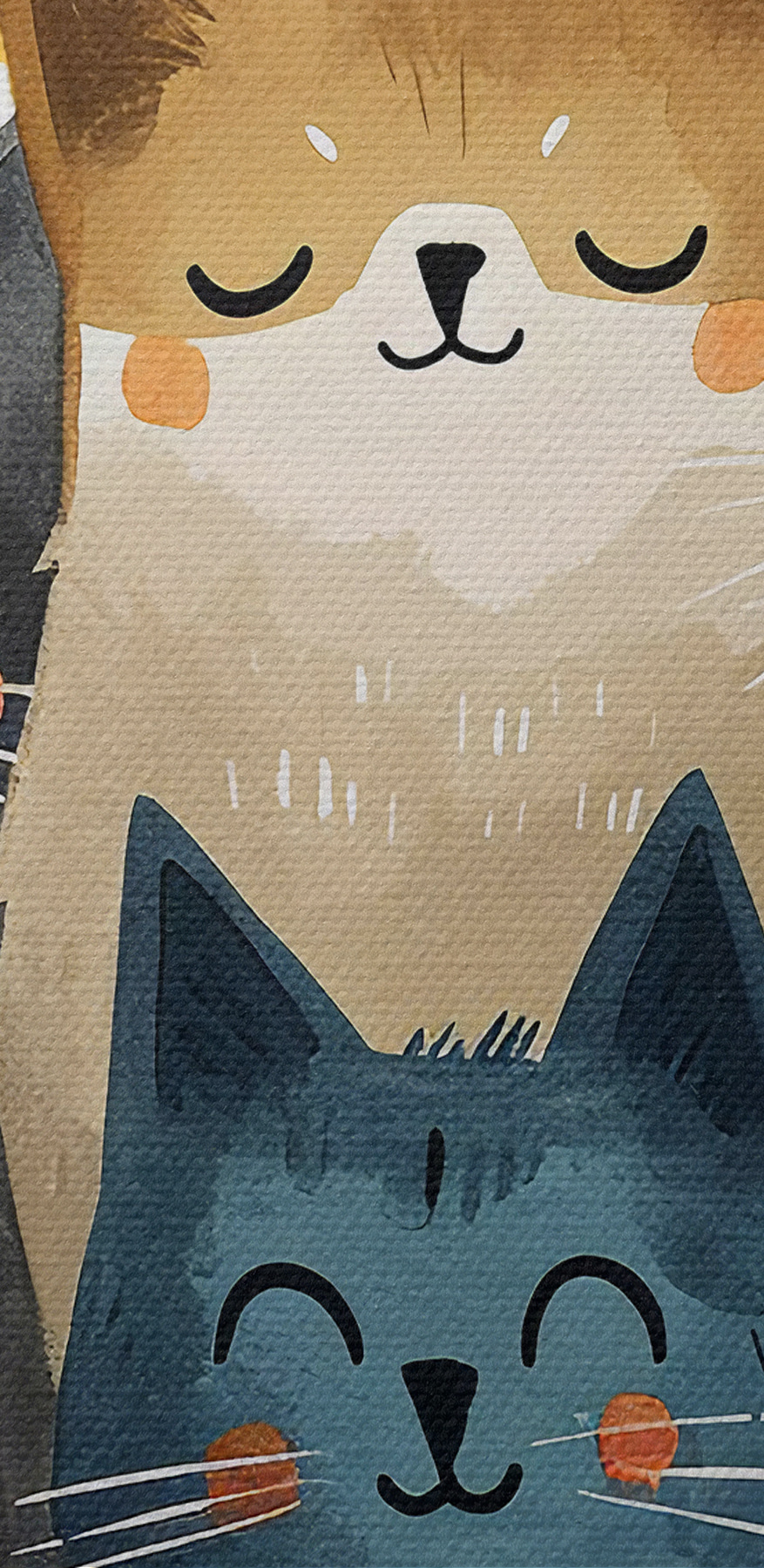 Het is geweldig om een speelse sfeer te creëren, alsof een sprookjesboek tot leven komt. Hang het op in de kinderkamer en kijk hoe snel het hun favoriet wordt! Denk aan verhaaltjes over fantastische katten voor het slapengaan. Of hang het in je woonkamer – meteen een gespreksonderwerp. “Oh, die blauwe kat? Hij heet Whisker McGee!” De kleuren zijn helder maar zacht, waardoor het huiselijk en lief aanvoelt, of je nu vijf of vijfenvijftig bent.