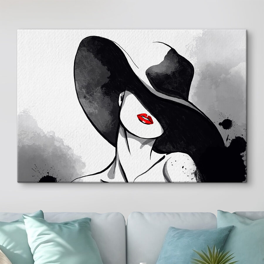 Stel je voor dat je een vleugje moderne elegantie aan je interieur toevoegt met deze canvasprint “Woman Wearing a Hat”. Het is een mooi stuk – gedurfd, een beetje mysterieus en oh-zo-chic. De opvallende rode lippen tegen de zwarte en witte aquarel geven het een bijna filmische uitstraling. Perfect voor als je je in een stijlvolle film noir wilt wanen. Zet het in je woon- of slaapkamer voor een instant conversatiestarter. Geloof me, het is niet zomaar een doek, het is een hele stemming!