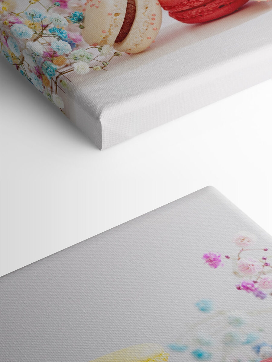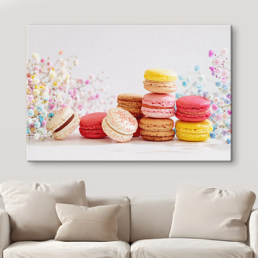 Fleur elke kamer op met dit charmante canvas met kleurrijke macarons tussen delicate bloemen. Het is als een zoete uitnodiging tot verwennerij zonder de calorieën. Elke macaron knalt van kleur, danst speels tegen een zachte achtergrond en inspireert tot glimlachen en dagdromen over moeiteloze elegantie. Stel je voor dat dit stuk in een gezellige keuken of een schilderachtig caféhoekje hangt; het brengt meteen een vleugje Parijse flair. Perfect voor iedereen die gelooft dat je van het leven moet genieten, één verrukkelijke traktatie per keer. Het is meer dan alleen kunst; het is een klein moment van vreugde.