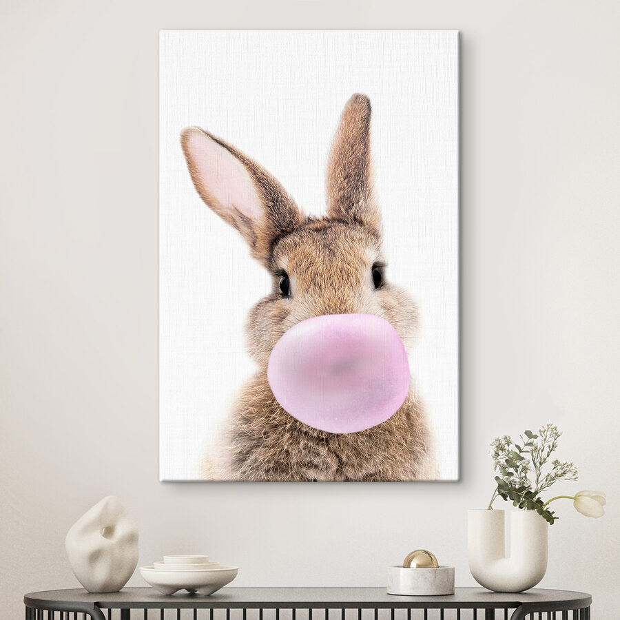 Stel je voor: je loopt een kinderkamer binnen en *bam*, daar zie je een superleuke canvasprint. Het is een konijn, maar niet zomaar een konijn. Deze kleine haarbal blaast een kauwgombubbel! Hoe hilarisch schattig is dat? Perfect om te giechelen en een grillig tintje aan de ruimte te geven.